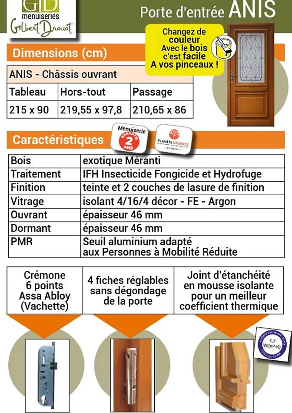 Decouvrez notre porte d’entree en bois vitree modele Anis, conçue pour allier esthetique moderne et fonctionnalite. Avec ses dimensions de 215 cm de hauteur et 90 cm de largeur, (219.6 x 97.8 cote totale hors tout) cette porte est ideale pour une installation en façade, adaptee tant aux batiments residentiels qu’aux espaces professionnels. Elle garantit une qualite superieure et une finition impeccable.