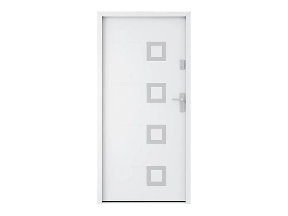 Vous cherchez une porte d’entrée moderne qui se fera remarquer ? Notre modèle de porte d’entrée TIFANA sera parfait pour mettre en valeur votre entrée ! Composé de quatre carrés à l’aspect design, cette porte est à la fois esthétique, résistante et isolante.Caractéristiques Couleur (nuance) : Blanc Matière (précision) : Acier Type de porte : Porte simple Coefficient de résistance thermique : 1.5 Affaiblissement acoustique : 29 dB Equipement inclus : Poignée, Serrure à clé, Huisserie Nombre de jeux de clés : 6 Type de pose : en tunnel (ou en tableau) Sens d’ouverture : Poussant gauche Utilisation : Extérieur Gamme : Good for Planet Produit : Fabriqué en Europe Livré monté (sauf pieds et/ou poignées) Hauteur du seuil : 20 mm Epaisseur du dormant : 110 mm Epaisseur de l’ouvrant : 55 mm Nombre de points de serrure : 2 Couleur face extérieure : blanc (RAL 9002) Couleur face intérieure : blanc (RAL 9002)Dimensions Longueur : 95 cm Hauteur : 203.5 cm Profondeur : 9 cm Longueur hors tout : 100 cm Hauteur hors tout : 207 cm Profondeur hors tout : 11 cm Epaisseur de l’ouvrant : 55 mmLivraisonColisColis n°1 : Longueur 210 cm, Largeur 103 cm, Hauteur 13 cm, Poids 41 kg.