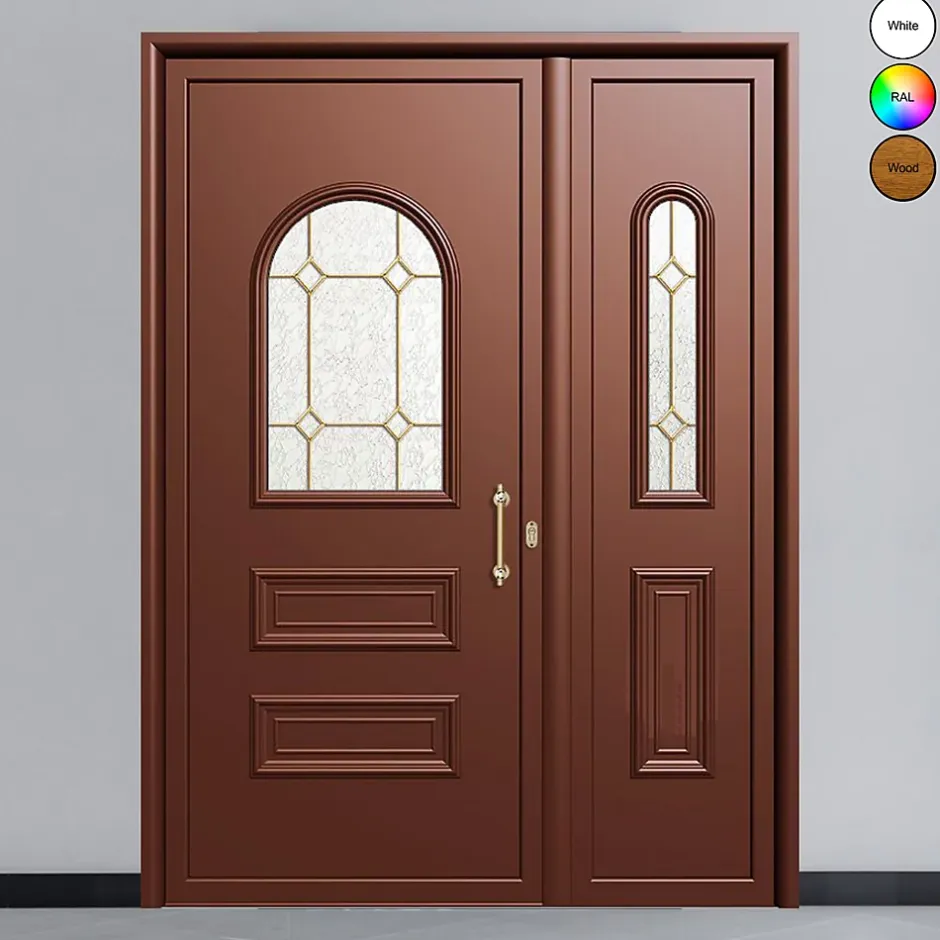 Porte d’entrée en aluminium – Code 2305-3661 | RAL 8004 | Vitrage Delta Mat avec baguettes doréesLa porte d’entrée aluminium 2305-3661 combine un style décoratif soigné et des performances adaptées aux exigences actuelles. Sa teinte RAL 8004 (brun cuivré) apporte un rendu chaleureux, tandis que le vitrage Delta Mat avec baguettes dorées diffuse la lumière sans exposer l’intérieur, pour une entrée élégante et discrète.Conçue avec un profilé aluminium 55 mm ou 70 mm, elle intègre une rupture de pont thermique de 39 mm (insert polyamide) limitant les transferts de chaleur et la condensation. Associée à un double vitrage “4 saisons” de 24 mm, elle assure une très bonne isolation thermique et un confort acoustique renforcé. Adaptée au neuf comme à la rénovation, elle peut aussi recevoir des options de personnalisation et de sécurité selon votre projet.Points forts•Finition RAL 8004 : style classique chaleureux•Vitrage Delta Mat : intimité + lumière diffusée•Détails décoratifs : baguettes dorées•Isolation thermique performante (pont thermique 39 mm)•Isolation phonique renforcée•Réduction de la condensation•Structure aluminium robuste, vitrage sécurisé•Personnalisation : coloris RAL, poignée, sens d’ouvertureCaractéristiques techniques•Code produit : 2305-3661•Matériau : Aluminium•Coloris extérieur : RAL 8004 (autres RAL sur demande)•Vitrage : Delta Mat “4 saisons” – double vitrage 24 mm avec baguettes dorées•Poignée extérieure : Traditionnelle finition dorée•Épaisseur du profilé : 55 mm ou 70 mm•Technologie : Rupture de pont thermique 39 mm (insert polyamide)•Ouverture : Battante•Peinture : Thermolaquage – personnalisable RAL•Usage : Résidentiel – neuf ou rénovation•Style : Classique élégant avec touche moderne