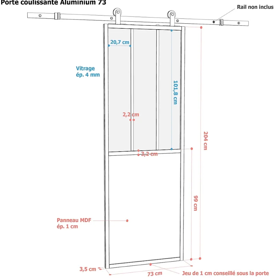 Porte seule en aluminium 3 carreaux vitrés transparent, coloris noir H.204 x l.73cm