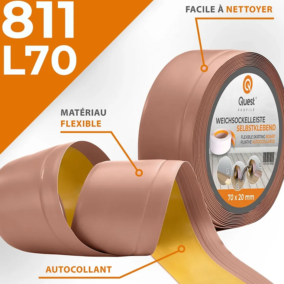 Quest Plinthe Souple Auto-Adhésive en PVC 70x20mm, 1m, Bande Flexible, Facile à Installer, Adaptée à Toutes Surfaces, brun clair