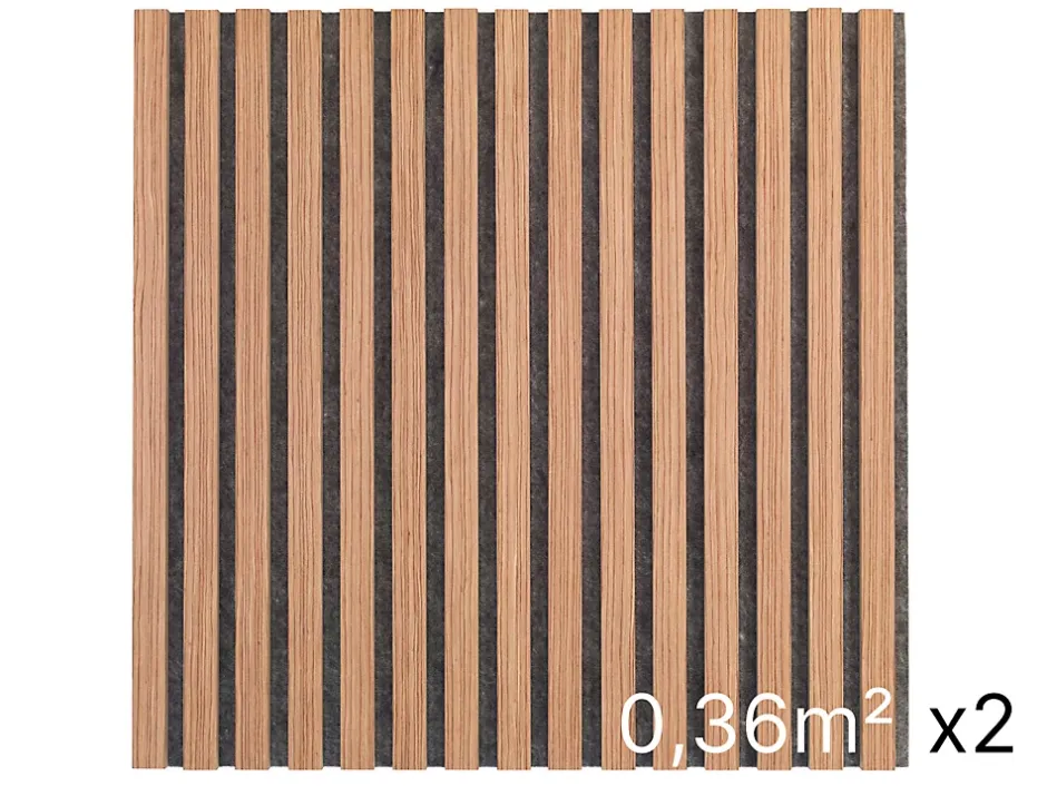 Améliorez l’acoustique de votre espace tout en y ajoutant une touche d’élégance naturelle avec nos panneaux muraux à lattes en bois massif.ACCOUSTIQUE DE POINTE Absorption acoustique efficace : Contrôlez les bruits indésirables et optimisez la qualité du son grâce à la conception ingénieuse du panneau et aux matériaux insonorisants de qualité supérieure.Un environnement sonore plus agréable : Profitez d’une meilleure clarté de la parole et d’une réduction du bruit ambiant, favorisant ainsi la concentration et la productivité.ESTHÉTHIQUE INTEMPORELLEBois massif naturel : Le panneau en bois de cerisier offre une apparence chaleureuse et raffinée qui s’intègre parfaitement à tous les styles de décoration.Design épuré et élégant : Les lattes ajoutent une touche de dimension et d’intérêt visuel à votre espace.DURABILITÉ EXCEPTIONNELLEConstruction robuste : Fabriqués avec des matériaux de qualité supérieure et un savoir-faire artisanal, ces panneaux sont conçus pour durer.Profitez d’une performance acoustique optimale et d’une beauté intemporelle pendant de nombreuses années.PERSONNALISATION SUR MESUREChoisissez parmi une variété d’essences de bois, de finitions et de styles pour créer un panneau qui correspond parfaitement à vos goûts et à votre décor.Créez une pièce maîtresse unique qui reflète votre style personnel et transforme l’atmosphère de votre pièce.CARACTÉRISTIQUES TECHNIQUES Dimensions: 60 cm (h) x 60 cm (l) x 2,2 cm (p) Couleur: Cerisier naturel Finition: Satiné Mode de fixation: À coller Matériau principal: MDF Revêtement: Plaqué bois Nombre de panneaux: 2 Surface par panneau: 0,36 m²