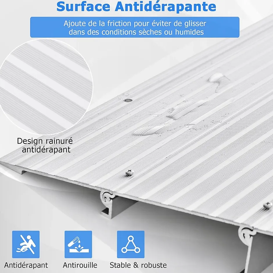 - Hauteur de rampe réglabCadre en aluminium robuste : Conçue pour résister à une utilisation intensive, cette rampe est fabriquée à partir d’un matériau en aluminium sélectionné qui garantit une durabilité à long terme. Il est résistant aux rayures et peut supporter une capacité de charge maximale de 317 kg, idéal pour le passage d’un diable, d’un fauteuil roulant, d’un véhicule électrique, d’un vélo ou d’une poussette.le : Le rabat réglable facilite la fixation de cette rampe de seuil à la hauteur souhaitée (4,5 à 10,5 cm), assurant une transition fluide entre les surfaces. De plus, les 4 sections de la rampe de seuil peuvent être fixées ou détachées pour obtenir un réglage en hauteur selon vos différents besoins.