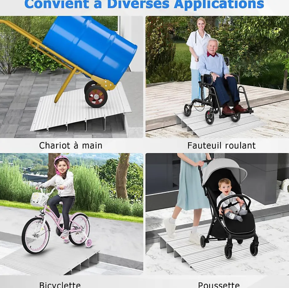 - Cadre en aluminium robuste : Conçue pour résister à une utilisation intensive, cette rampe est fabriquée à partir d’un matériau en aluminium sélectionné qui garantit une durabilité à long terme. Il est résistant aux rayures et peut supporter une capacité de charge maximale de 317 kg, idéal pour le passage d’un diable, d’un fauteuil roulant, d’un véhicule électrique, d’un vélo ou d’une poussette.