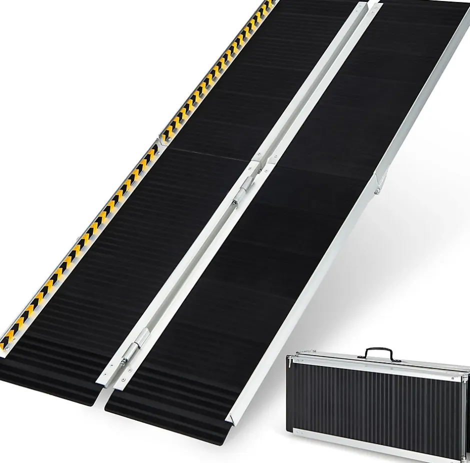 - Cadre en aluminium robuste : Cette rampe est fabriquée en aluminium robuste et inoxydable pour une plus grande longévité. Le matériau léger facilite le transport, tandis que le cadre robuste assure la stabilité et le soutien.