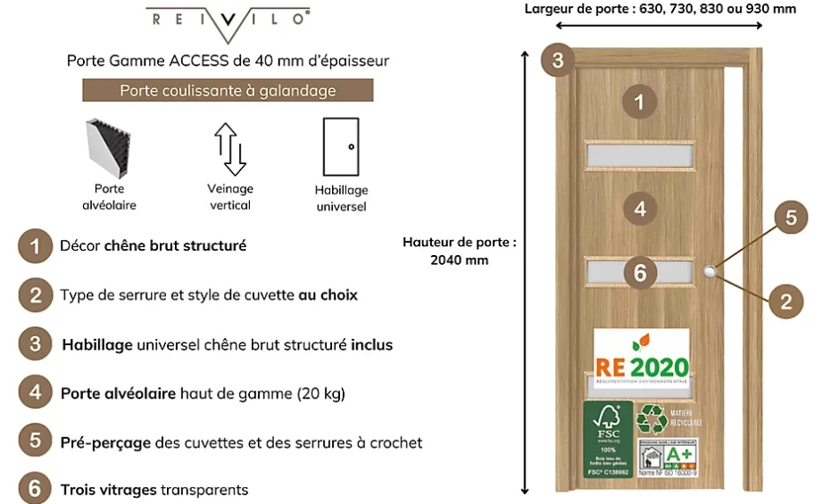 Voici les atouts de la porte coulissante à galandage April : finition aspect chêne brut structuré veinage vertical : alignement naturel avec le cadre et les couvre-joints, pour un rendu plus harmonieux et élégant pré-perçage des cuvettes et des serrures à crochet rainurage sous la porte porte alvéolaire haut de gamme (20 kg) 3 vitrages transparents pour laisser passer la lumière et gagner en perspective revêtement en CLPL (Continuous Low Pressure Laminate) : permet d’atteindre une combinaison idéale entre une adhérence parfaite aux contours et un effet naturel du revêtement certification : 100 % du bois est issu de forêts durablement gérées émissions dans l’air intérieur : A+ livrée avec un cache de propreté en argent brossé pour masquer l’usinage de la serrure à crochet habillage inclus Caractéristiques techniques de la porte coulissante à galandage April : serrure cuvette ronde chromée (celle-ci sera à monter sur la porte) rainurage de la largeur 5 x 15 mm sous porte à rive droite pour coulissant largeur 73 cm hauteur de porte : 204 cm poids porte seule : 24.80 kg poids colis complet : 36.23 kg