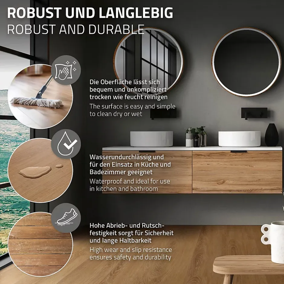 Description du produit:Découvrez le luxe à chaque étape avec notre revêtement de sol PVC vinyle de luxe avec système d’encliquetage en chêneVous voulez donner à votre maison une nouvelle apparence exquise ? Notre tout nouveau sol PVC vinyle de luxe à clipser à motif chêne est le choix parfait pour allier élégance et fonctionnalité. Un paquet correspond à 1,54 m² = 7 pièces de stratifié.Détails techniques:Design de haute qualité : le motif réaliste en chêne ajoute une touche de nature et de chaleur à votre pièce.Épaisseur de 4,2 mm : ce revêtement de sol se distingue par sa construction solide, qui garantit sa longévité et sa résistance.Facile à entretenir et résistant à l’usure : notre revêtement de sol en vinyle est un poids plume lorsqu’il s’agit de l’entretien. Il résiste à la saleté et à l’abrasion, ce qui lui permet de conserver son bel aspect sans trop d’efforts.7 Pièces par paquet : chaque paquet contient 7 pièces de sol en vinyle PVC, couvrant une surface généreuse de 1,54 m². Cela facilite considérablement la planification et l’installation.Caractéristiques:Système clicClasse d’émission E1 – la plus faible émission de substances nocivesAntidérapant selon le niveau DSÉpaisseur de 4,2 mmDurabilité et faible abrasionRésistant à l’eau – ne gonfle pasCompatible avec les pièces humidesFacile à entretenir et résistant à l’abrasionDifficilement inflammablePose facile et rapideRevêtement de sol vinyle moderne pour presque toutes les piècesConvient aux pièces à forte fréquentationLivraison:2 x Cartons de revêtement de sol vinyle ( 14 pièces = 3,08 m² )Information technique:Matériau : PVCCouleur : marron clairMotif : chênePoids : 12,6 kg par cartonContenu : 14 piècesSurface de couverture : 180 x 1220 mmSurface totale : 3,08 m²Épaisseur : 4,2 mmSystème de pose : système à clicLongueur : 122 cmLargeur : 18 cm