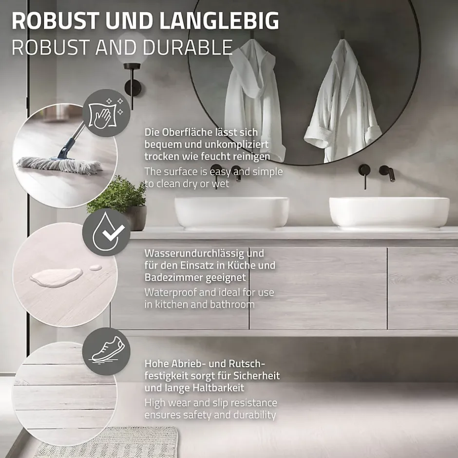 Découvrez la révolution en matière de revêtement de sol : notre vinyle adhésif à motif bois Chêne blanc allie style, simplicité et fonctionnalité en un seul paquet ! Un paquet contient 16 planches, suffisant pour une surface généreuse de 2,23 m².Caractéristiques du produit :Résistant à l’eau : notre revêtement de sol ne résiste pas seulement à l’usage quotidien, mais aussi à l’humidité. Profitez de la tranquillité d’esprit que procure un sol résistant à l’eau, idéal pour les cuisines, les salles de bains et autres environnements humides.Facile à installer : fini les installations compliquées ! Notre revêtement de sol vinyle adhésif est très facile à coller. Grâce à la facilité d’installation, vous pouvez transformer votre pièce en un clin d’œil, sans avoir besoin de l’aide d’un professionnel.16 pièces par paquet : chaque paquet contient 16 planches, ce qui est suffisant pour couvrir une surface de 2,23 m². Caractéristiques:Revêtement de sol PVC vinyle autocollant de luxe en chêneClasse de pollution E1 – la plus faible émission de substances nocivesAntidérapant selon le niveau DS2 mm d’épaisseurRésistant à l’eau – ne s’éponge pasLongue durée de vie et peu d’usureCompatible avec les pièces humidesFacile à entretenir et résistant à l’abrasionHautement inflammableInstallation facile et rapideVinyle de sol moderne pour presque toutes les piècesConvient aux pièces à forte fréquentationRésistant aux moisissures, antiallergique, antistatique, etc.Isolant thermique et insonorisantRésistant et antidérapantFacile à poser et à entretenirIdéal pour tous les types de surfaces solides et planes Livraison:3 x Revêtement de sol vinyle adhésif ( 48 pièces = 6,69 m² ) Information technique:Matériau : PVCCouleur : blancMotif bois : chênePoids : 8,8 kg/cartonDimensions par planche (Lxl) : 91,5 cm x 15,3 cmÉpaisseur : 2 mmContenu : 16 pièces/cartonSurface totale : 6,69 m²Système de pose : sol vinyle adhésifLongueur : 91,5 cmLargeur : 15,3 cm