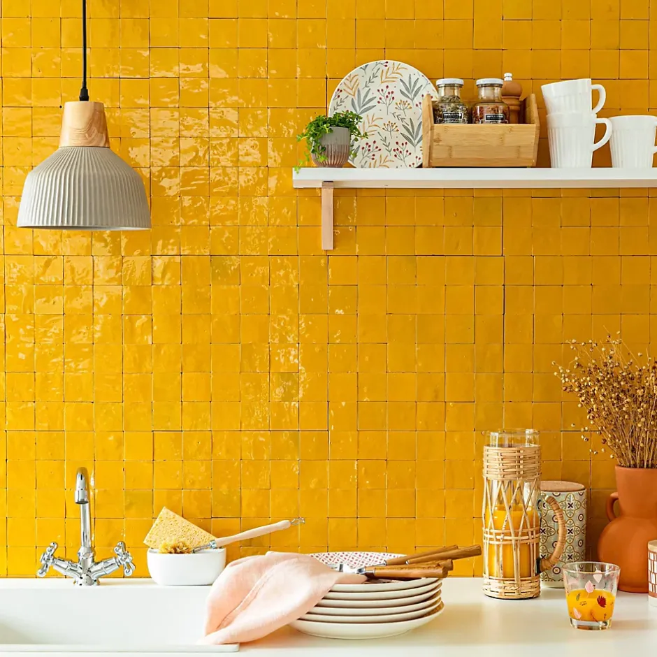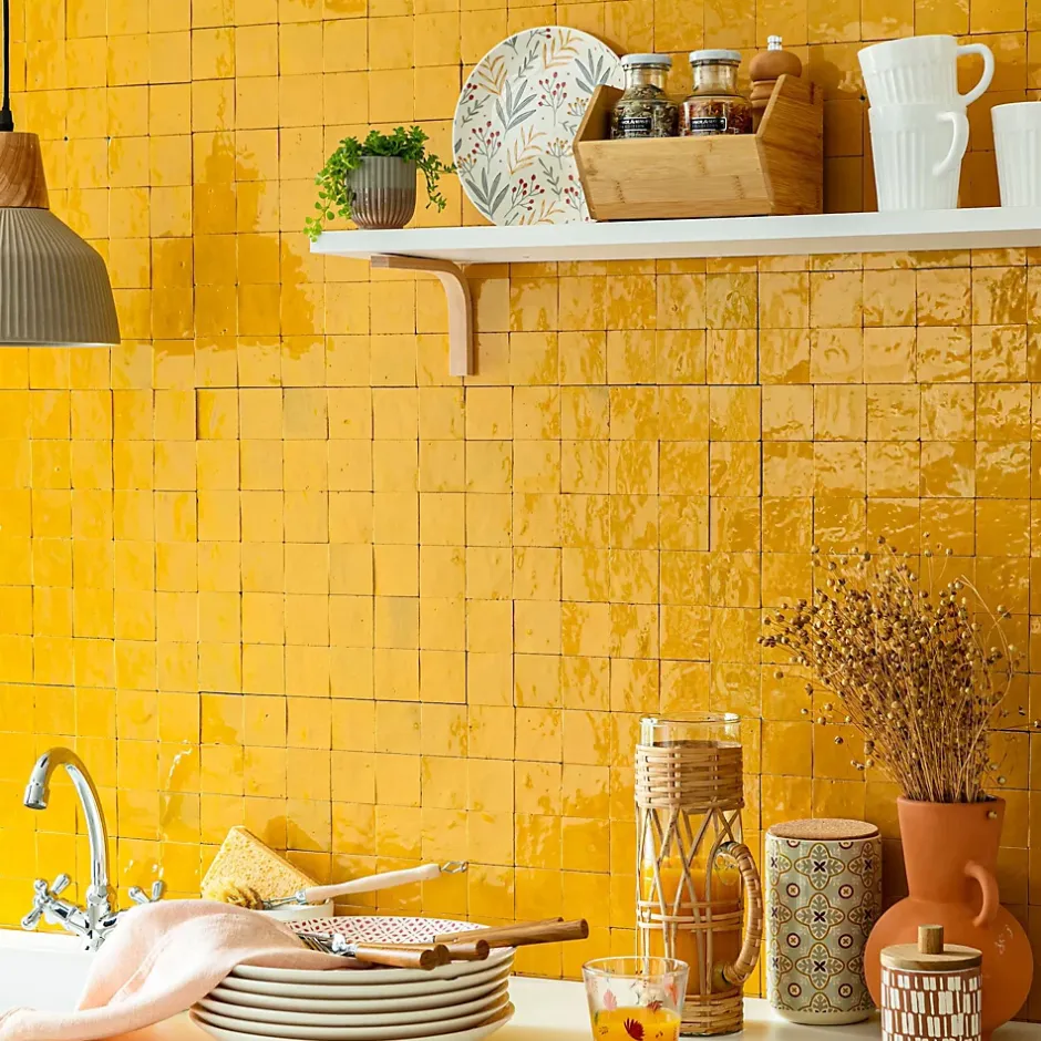 – DESCRIPTION -Cette mosaïque de Carrelage Zellige Marocain s’intégrera à la perfection dans vos aménagements de cuisine ou de salle de bains.Matière : Terre cuite émailléeCouleur : Jaune MoutardeFormat des carreaux : 5×5 cm Format de la plaque : 30×30 cm Epaisseur : 1 cm Finition : Taillé mainOrigine : MarocUtilisation : Intérieur (Mur) Conditionnement : plaques de 30×30 cm soit 0,09 m²- INFORMATIONS -> Du fait de sa fabrication manuelle et artisanale, le zellige est par essence un revêtement imparfait. Les authentiques carreaux de zelliges marocains sont moulés, taillés et émaillés exclusivement à la main selon des méthodes traditionnelles ancestrales. Ces carreaux sont caractérisés par leurs irrégularités et leurs imperfections.Ces particularités purement esthétiques n’altèrent en rien les caractéristiques techniques des produits.En voici une liste non exhaustive :- Eclats sur l’émail ou dans les coins,- Bosses et irrégularités de planéité,- Creux ou trous pouvant laisser apparaitre l’argile,- Craquelures sur la surface de l’émail,- Révélation de l’argile à travers l’émail,- Variations de couleurs, de nuances et de tons,- Variations d’épaisseurs et de dimensions,- Sur trame : irrégularités d’espacements entre les pièces.> Si vous souhaitez un carrelage parfait : alors n’achetez pas de zellige authentique mais reportez vous sur de la céramique industrielle imitation zellige.> Nos photos sont réalisées par des professionnels avec l’objectif de représenter les produits de la façon la plus fidèle possible. Cependant, en fonction de votre écran et des paramètres appliqués, l’aspect et les couleurs du produit sur votre écran peuvent légèrement différer du produit original.- LIVRAISON -Forfait frais de port : tarif unique, sans limite de quantité.