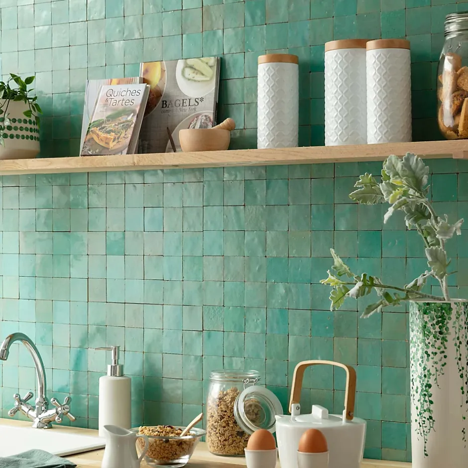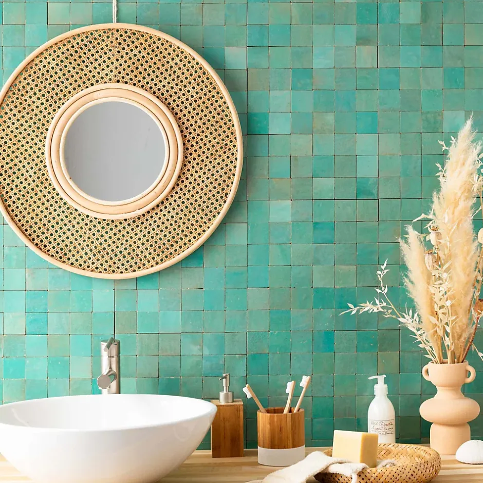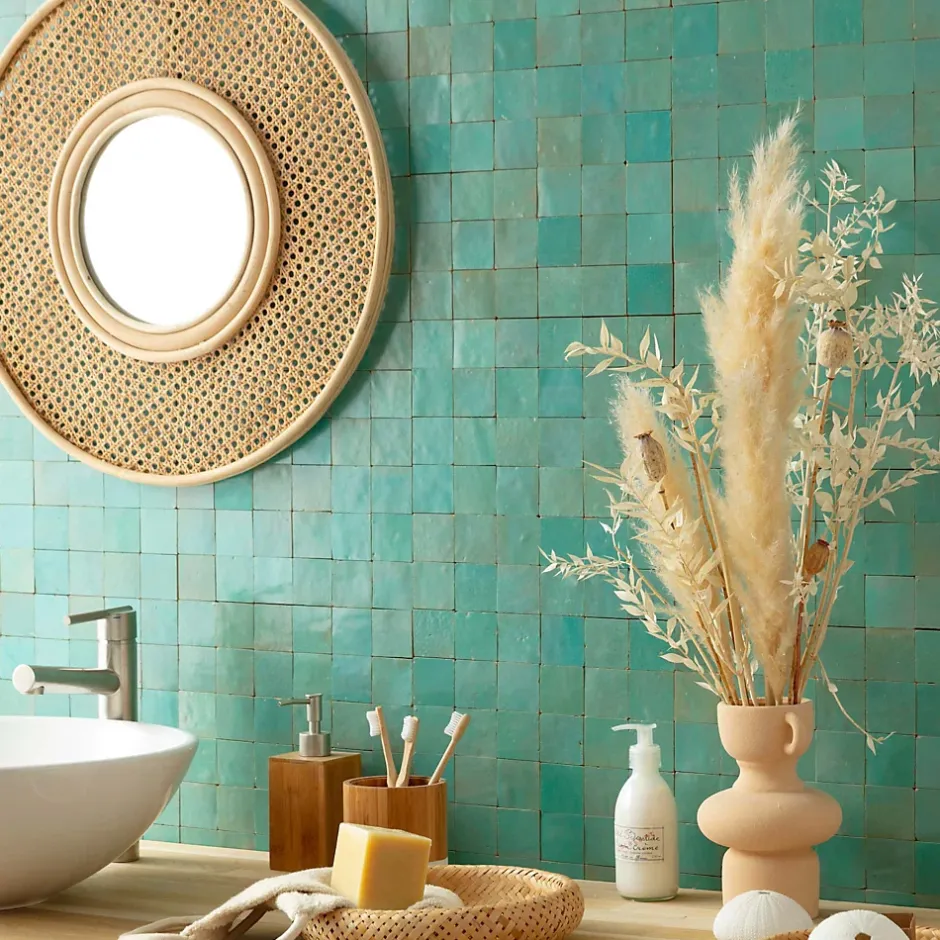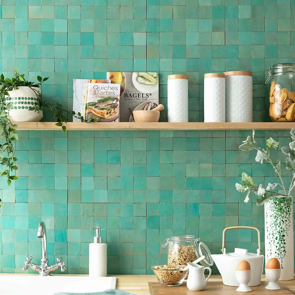 – DESCRIPTION -Cette mosaïque de Carrelage Zellige Marocain s’intégrera à la perfection dans vos aménagements de cuisine ou de salle de bains.Matière : Terre cuite émailléeCouleur : Vert PacifiqueFormat des carreaux : 5×5 cm Format de la plaque : 30×30 cm Epaisseur : 1 cm Finition : Taillé mainOrigine : MarocUtilisation : Intérieur (Mur) Conditionnement : plaques de 30×30 cm soit 0,09 m²- INFORMATIONS -> Du fait de sa fabrication manuelle et artisanale, le zellige est par essence un revêtement imparfait. Les authentiques carreaux de zelliges marocains sont moulés, taillés et émaillés exclusivement à la main selon des méthodes traditionnelles ancestrales. Ces carreaux sont caractérisés par leurs irrégularités et leurs imperfections.Ces particularités purement esthétiques n’altèrent en rien les caractéristiques techniques des produits.En voici une liste non exhaustive :- Eclats sur l’émail ou dans les coins,- Bosses et irrégularités de planéité,- Creux ou trous pouvant laisser apparaitre l’argile,- Craquelures sur la surface de l’émail,- Révélation de l’argile à travers l’émail,- Variations de couleurs, de nuances et de tons,- Variations d’épaisseurs et de dimensions,- Sur trame : irrégularités d’espacements entre les pièces.> Si vous souhaitez un carrelage parfait : alors n’achetez pas de zellige authentique mais reportez vous sur de la céramique industrielle imitation zellige.> Nos photos sont réalisées par des professionnels avec l’objectif de représenter les produits de la façon la plus fidèle possible. Cependant, en fonction de votre écran et des paramètres appliqués, l’aspect et les couleurs du produit sur votre écran peuvent légèrement différer du produit original.- LIVRAISON -Forfait frais de port : tarif unique, sans limite de quantité.
