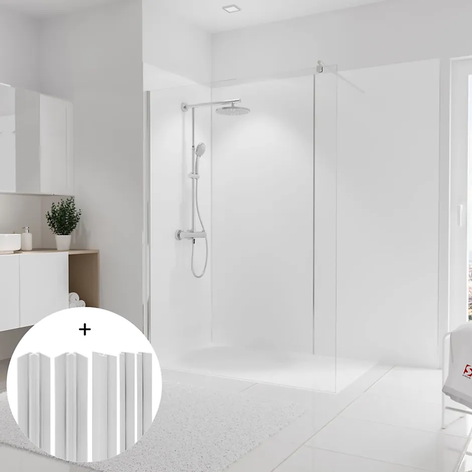 Lot de 3 panneaux muraux + 5 profilés, 90 x 90 x 90 x 210 cm, blancs, Schulte DécoDesignVous souhaitez remplacer votre baignoire par une douche, habiller des petites surfaces derrière des toilettes ou un lavabo, changer la déco de votre salon, salle à manger ou de votre chambre, ou encore faire une crédence dans une cuisine ? Les panneaux muraux DécoDesign COULEUR de Schulte, c’est le revêtement idéal pour éviter des travaux contraignants et salissants. La pose de ce panneau mural décoratif de salle de bain est particulièrement facile. Il vous suffit tout simplement de coller les plaques sur votre ancienne faïence, du placo ou tout autre revêtement.AVANTAGES PRODUIT :- Pratique et idéal pour vos rénovations : se pose sur l’ancienne faience et carrelage- Economique : pas de gros travaux nécessaire et excellent rapport qualité-prix- Extra-fin 3 mm : pas de perte d’espace- Do it yourself : panneau à coller pour une installation rapide et facile- Travaux sans poussière ni bruit- Découpe facile: pas besoin d’outils professionnels- Etanche : surface hydrofuge et imperméable- Impression digitaleDÉTAILS TECHNIQUES :- Composite en aluminium- Épaisseur : 3 mm- Livré avec un adhésif double face, 2 cales de montage, 2 profilés de finition, 1 profilé d’extension et 2 profilés d’angle- Silicone non inclus- Garantie produit : 10 ans- Garantie réapprovisionnement pièce détachées : 10 ans- Remarque : en fonction des réglages de votre écran, les couleurs peuvent différer des teintes originales