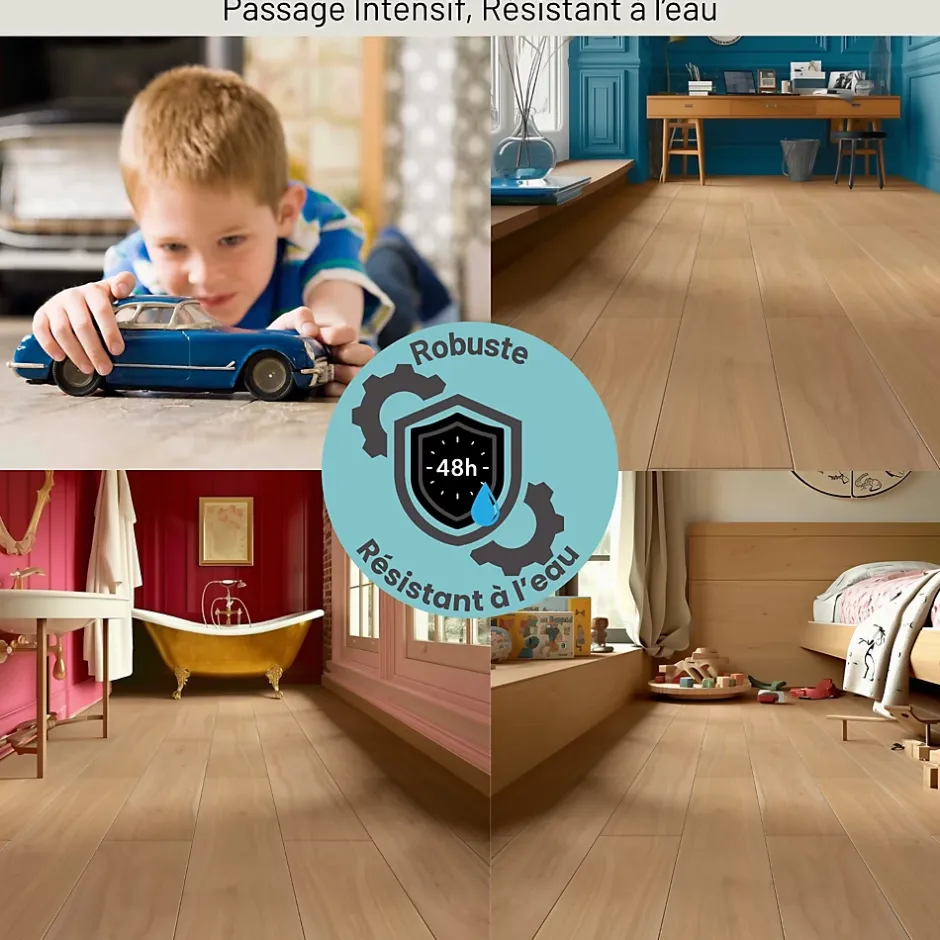 - Résistance à l’eau pendant 48 heures et compatible chauffage au sol