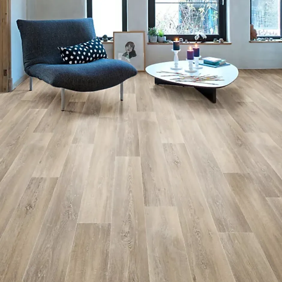 Marque : Beauflor B.I.G. Floorcoverings – Trento Lime Oak 160LSol pvc résistant et simple à poser, qui convient pour toutes les pièces de la maison, y compris la cuisine.Sol PVC sans métaux lourds, sans solvants, sans phtalates, sans formaldéhyde ni plastifiants nocifs.• CHAUFFAGE PAR LE SOL : Oui• LARGEUR D’UNE LAME SUR LE DESSIN : 20 cm• CLASSE COV : A+• CLASSEMENT EUROPÉEN : Usage Public et Commercial – Classe 31 : Trafic faible/intermittent (bureau individuel, chambre d’hôtel), Usage Domestique – Classe 23 : Trafic intense (chambre, salon, hall d’entrée, salle à manger, couloir, salle de bain, cuisine, pièces avec accès sur l’extérieur)• CLASSEMENT FEU : Bfl-s1 (ancienne norme M3)• CLASSE FORMALDÉHYDE : E1• COMPORTEMENT ÉLECTROSTATIQUE : 2Kv (sur ciment)• ÉPAISSEUR COUCHE D’USURE : 0,25 mm• ÉPAISSEUR TOTALE : 2,8 mm• GARANTIE : 7 ans en usage résidentiel• GROUPE D’ABRASION : T (EN 660-2)• INCURVATION : moins de 8 mm• ISOLATION PHONIQUE : 16 dB• POIDS TOTAL : 1650 g/m²• RÉSISTANCE AU POINÇONNEMENT : – de 0,35 mm• RECYCLABLE : Oui• RÉSISTANCE THERMIQUE : 0,019 m² K/W• SOLIDITÉ À LA LUMIÈRE : + de 6• RÉSISTANCE AU GLISSEMENT : R10• RÉSISTANCE CHIMIQUE : Bonne• STABILITÉ DIMENSIONNELLE : – de 0,40 %• Tolérance sur la largeur et la longueur : ±3%IMPORTANT : Merci de noter que nous ne pouvons pas garantir une même teinte de couleur sur nos différentes largeurs de rouleaux (2m, 3m ou 4m de large), information à prendre en considération si vous souhaitez faire un raccord à partir de 2 largeurs de rouleaux différentes.