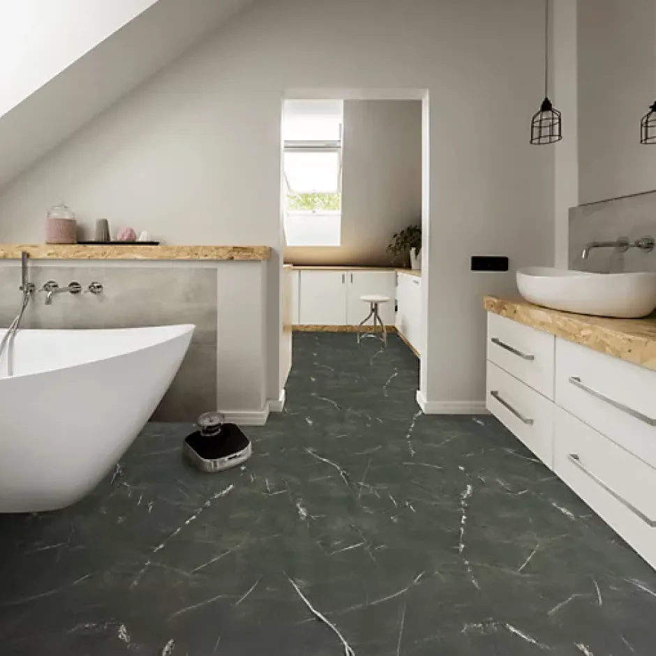 Sol vinyle à la surface mate offrant une protection améliorée contre les taches et les rayures.Son motif marbre noir, à la finition mate, sublimera votre intérieur avec élégance et s’adaptera à de nombreux style déco. Idéal pour toutes les pièces : salon, chambre, cuisine, salle de bain, bureau et couloir.Propriétés d’insonorisation remarquables, davantage de confort à la marche et anti-bruit.Nos sols PVC sont dotés de couches d’usure hautes performances qui les protègent contre les salissures et la poussière. Un peu d’eau suffira à les garder propres et hygiéniques toute leur vie, pas besoin de produits agressifs ou d’appareils gourmands en énergie.Nos sols PVC répondent aux exigences les plus strictes en termes de qualité de fabrication, d’hygiène et de sécurité, ainsi que d’environnement.- ASPECT : Mat- CHAUFFAGE PAR LE SOL : Oui- CLASSE COV : A+- CLASSEMENT EUROPÉEN : Usage Domestique – Classe 23 : Trafic intense (chambre, salon, hall d’entrée, salle à manger, couloir, salle de bain, cuisine, pièces avec accès sur l’extérieur), Usage Public et Commercial – Classe 31 : Trafic faible/intermittent (bureau individuel, chambre d’hôtel)- CLASSEMENT FEU : Cfl-s1 (ancienne norme M3)- CONDUCTIVITÉ THERMIQUE : 0,25 W/MK- COUCHE D’USURE : 0,25 mm- ÉPAISSEUR : 2,5 mm- FABRICATION : Européenne- ISOLATION PHONIQUE : 18 dB- POIDS : 1650 g/m²- RÉSISTANCE AU GLISSEMENT : R11- RÉSISTANCE CHIMIQUE : Très bonne- RÉSISTANCE THERMIQUE : 0,00104 m² K/W- TRAITEMENT DE SURFACE : PU• Tolérance sur la largeur et la longueur : ±3%IMPORTANT : Différences possibles de teinte entre rouleaux de largeurs différentes (2m, 3m, 4m). À considérer en cas de raccords. Évitez les tapis ou protections en caoutchouc/latex qui peuvent laisser des taches indélébiles. Privilégiez des protections en feutre pour les pieds de meubles.