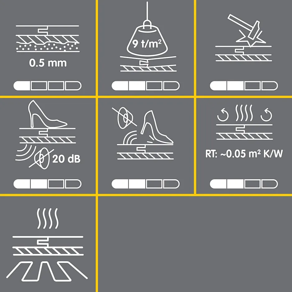 - Testée conformément aux groupes d’exigences plus élevées 1 et 2 de MMFA/EPLF. Compense les irrégularités du sol. Réduction élevée des bruits de pas