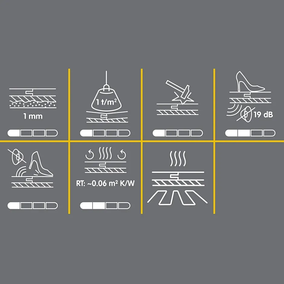 Cette sous-couche en mousse de polyéthylène convient pour une utilisation avec stratifiés. Elle permet de niveler les sols irréguliers, offre une isolation phonique et peut être utilisée avec le chauffage au sol. Performances basiques pour usages moins exigeants, elle isole du support et prévient les remontées d’humidité. Elle améliore le confort de marche et réduit les bruits de pas à 19 dB et compense les irrégularités du sol. Elle s’adapte à des revêtements de sol en bois massif et stratifié, en bois et en béton.