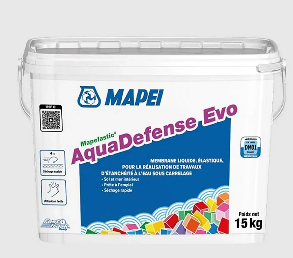 – Système d’étanchéité sous carrelage MAPELASTIC AQUADEFENSE EVO – Matière: membrane liquide, élastique- Coloris: bleu clair- Finition: prêt à l’emploi- Aspect: pateux- Forme: en seau- Membrane liquide, élastique, prête à l’emploi et à séchage rapide pour la réalisation de travaux d’étanchéité à l’eau sous carrelage- Permet de réaliser une étanchéité avant la pose de carrelage, de pierre ou de mosaïque en sol et mur intérieurs- S’utilise en neuf et en rénovation- Facile à utiliser car le produit est prêt à l’emploi- Mise en œuvre rapide et facile- Séchage rapide la 2ème couche après 1 heure et l e carrelage peut être posé de 4 à 6h seulement après l’application (à +20°C)- S’applique sur des supports variés tels que le béton, les chapes à base de ciment ou chapes réalisées au moyen de liants spéciaux (Topcem, Topcem Pronto, Mapecem X’Press, ou Mapecem Pronto X’Press)- S’utiise également sur plaques de plâtre cartonnées, carreaux de plâtre (après application de Primer G), carreaux de terre cuite (après application de Primer G), enduits à base de ciment ou ancien carrelage- Les résidus de Mapelastic Aquadefense Evo encore frais se nettoient à l’eau Présentation et quantité – Présentation: en s eau – Quantité: 7 ou 15 kg selon l