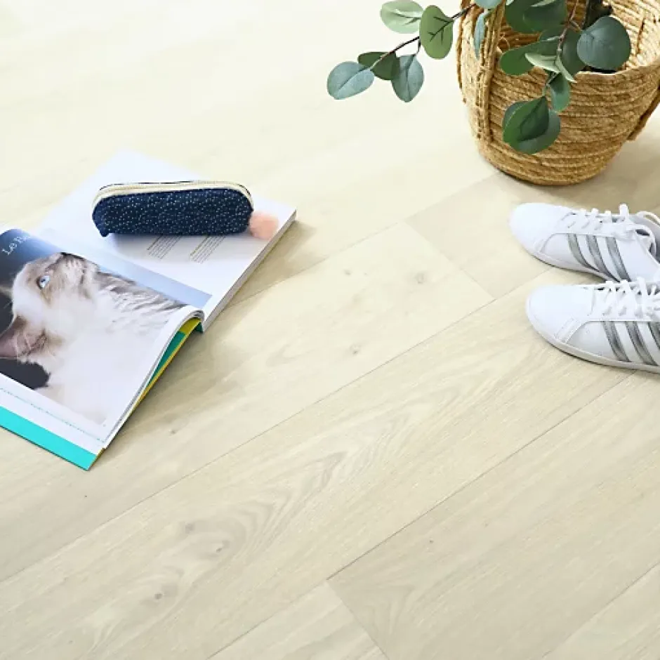 Marque : Tarkett – Iconik Life – Amboise Blanc • Sol vinyle au meilleur rapport qualité/prix. Un sol confortable, offrant une bonne insonorisation et un entretien facile avec son traitement de surface. Taille d’une lame : 16,6 x 100 cm • Faibles émissions de COV • CHAUFFAGE PAR LE SOL : Oui (27°C max.) • CLASSE COV : A+ • CLASSEMENT EUROPÉEN : Usage Domestique – Classe 22 : Trafic moyen (chambre, salon sans accès sur l’extérieur, hall d’entrée d’appartement, couloir, salle de bain), Usage Domestique – Classe 22+ : Trafic moyen/fort (chambre, salon, hall d’entrée, salle à manger, couloir, salle de bain) • CLASSEMENT FEU : Cfl-s1 (ancienne norme M3) • CLASSE FORMALDÉHYDE : E1 • COMPOSITION : Base de polychlorure de vinyle expansé (ISO 26986) • COMPORTEMENT ÉLECTROSTATIQUE : 2Kv (EN 1815) • CONTENU RECYCLÉ : 20% • ÉPAISSEUR COUCHE D’USURE : 0,22 mm • ÉPAISSEUR TOTALE : 2,6 mm • ISOLATION PHONIQUE : 20 dB • POIDS TOTAL : 1475 g/m² • RÉSISTANCE AU POINÇONNEMENT : 0,17 mm • RECYCLABLE : Oui • RÉSISTANCE THERMIQUE : 0,04 m² K/W • SOLIDITÉ À LA LUMIÈRE : 6 • RÉSISTANCE AU GLISSEMENT : R9/R10 • RÉSISTANCE CHIMIQUE : Très bonne • STABILITÉ DIMENSIONNELLE : 0,2 % • TRAITEMENT DE SURFACE : Extreme Protection • Tolérance sur la largeur et la longueur : ±3% • IMPORTANT : Nuances de couleurs de bain sur nos sols PVC Merci de noter que nous ne pouvons pas garantir une même teinte de couleur sur nos différentes largeurs de rouleaux (2m, 3m ou 4m de large). Information à bien prendre en considération si vous souhaitez faire un raccord, dans une même pièce, à partir de 2 largeurs de rouleaux différentes.