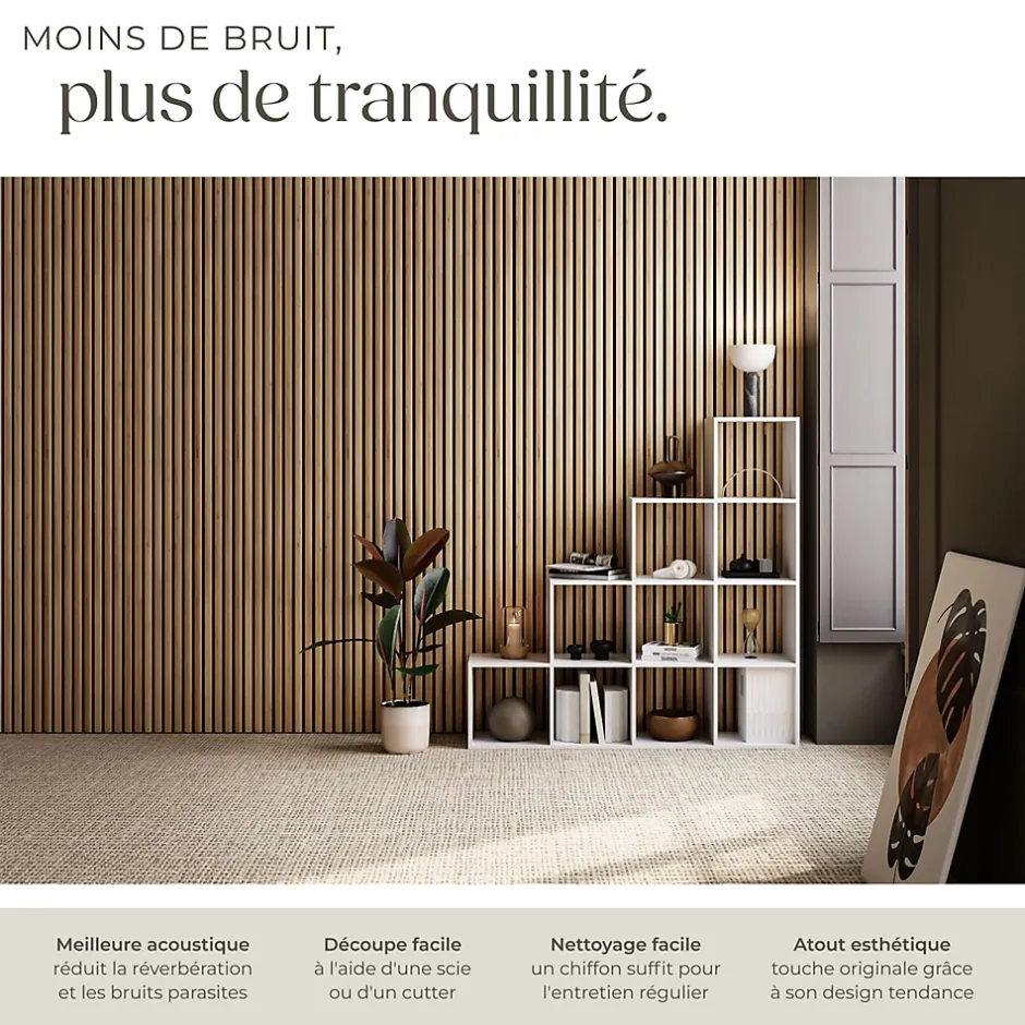 - Points Forts:Ensemble élégant de panneaux acoustiques en MDF haut de gamme et placage en bois véritableExcellente absorption acoustique grâce à la combinaison de feutre et de lamelles de boisDesign moderne dans un style scandinave chaleureuxTaille ajustable grâce à la découpeMontage facile à l'aide de colle ou de visPossibilité d'extension sans jointure avec d'autres ensembles