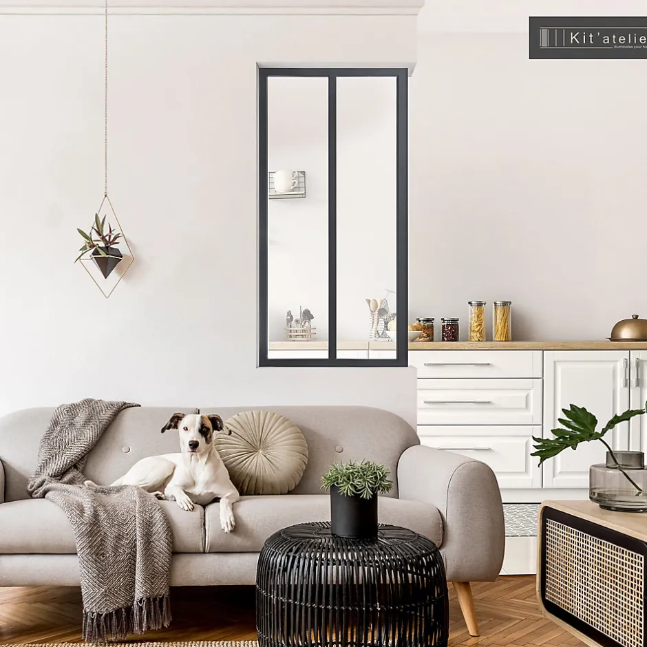 Avec sa finition aluminium thermolaqué noir sablé, la Verrière Atelier apporte une touche de style industriel chic à votre intérieur. Son ouverture haute offre une impression d’espace et invite la lumière à circuler naturellement entre les pièces. Épaisseur de profil 32 mm. Verrière de fabrication française (aluminium extrudé dans le Nord, usinage réalisée dans les Hauts-de-France), vendue en kit et facile à installer soi-même. Vitrage sécurité 4 mm inclus. Quincaillerie fournie (hors quincaillerie de fixation au mur). Pose en angle ou à flanc de mur possible (poteaux de finition et d’angle vendus séparément).