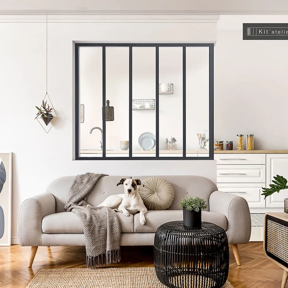 Avec sa finition aluminium thermolaqué noir sablé, la Verrière Atelier apporte une touche de style industriel chic à votre intérieur. Son ouverture haute offre une impression d’espace et invite la lumière à circuler naturellement entre les pièces. Épaisseur de profil 32 mm. Verrière de fabrication française (aluminium extrudé dans le Nord, usinage réalisée dans les Hauts-de-France), vendue en kit et facile à installer soi-même. Vitrage sécurité 4 mm inclus. Quincaillerie fournie (hors quincaillerie de fixation au mur). Pose en angle ou à flanc de mur possible (poteaux de finition et d’angle vendus séparément).