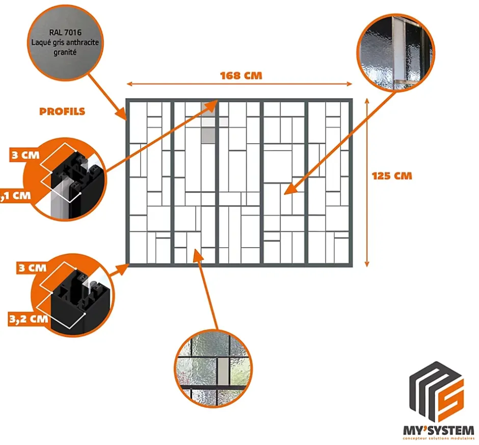 Verrière 5 verres Chicago – L x H : 168 x 125 cm – Laqué gris 7016 granité – verre Sahara inclus-MySystem Discount