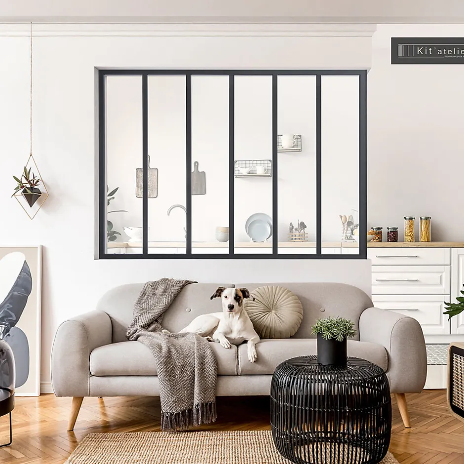 Avec sa finition aluminium thermolaqué noir sablé, la Verrière Atelier apporte une touche de style industriel chic à votre intérieur. Son ouverture haute offre une impression d’espace et invite la lumière à circuler naturellement entre les pièces. Épaisseur de profil 32 mm. Verrière de fabrication française (aluminium extrudé dans le Nord, usinage réalisée dans les Hauts-de-France), vendue en kit et facile à installer soi-même. Vitrage sécurité 4 mm inclus. Quincaillerie fournie (hors quincaillerie de fixation au mur). Pose en angle ou à flanc de mur possible (poteaux de finition et d’angle vendus séparément).