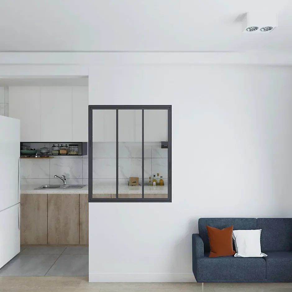 Verrière d’intérieur 93 x 108 cm, 3 carreaux transparents, cadre et profilés noirsCloisonner tout en laissant passer la lumière naturelle, c’est l’atout principal des verrières intérieures. Ces séparations vitrées aux allures loft et atelier optimisent votre aménagement en offrant de nouvelles perspectives dans vos pièces : plus de volume, de transparence et de caractère. Les cloisons en verre délimitent les espaces sans les séparer. On les adore entre la cuisine et la pièce à vivre, entre une chambre parentale et la salle de bains, mais aussi comme fenêtre intérieure dans des bureaux.AVANTAGES PRODUIT :- Semi-ouverture : délimite les espaces sans vraiment les séparer. Permet de cloisonner sans fermer- Transparence : apporte de la lumière naturelle dans vos deux pièces. Idéal pour éclairer des espaces sans fenêtre ou sombres (combles)- Effet volume : agrandit ou prolonge optiquement la pièce. Limite la sensation d’enfermement. Offre une perspective sur la pièce voisine- Isolation : atténue les bruits et les odeurs de cuisine- Esthétisme : donne un cachet industriel à votre intérieur. Élément décoratif à part entière- Kit prêt à poser : montage à la portée de tous.DETAILS :- Verre de sécurité trempé de 4 mm- Largeur : 930 mm- Épaisseur : 40 mm- Hauteur : 1080 mm- Poids : 21 kg- 3 carreaux- Cadre et profilés entre les carreaux en acier noir- Résistant aux rayures et aux chocs grâce au revêtement en poudre et au verre de sécurité- Montage facile par vissage (inclus : kit de montage avec chevilles et vis pour murs en béton)- Produit entièrement prémonté- Convient aux matériaux de construction suivants : murs en pierre, béton, placoplâtre