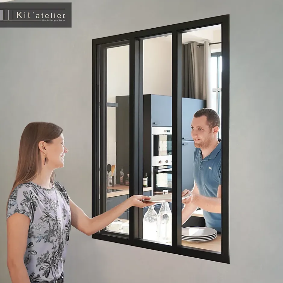 Avec sa finition aluminium thermolaqué noir sablé, la Verrière Atelier apporte une touche de style industriel chic à votre intérieur. Son ouverture haute offre une impression d’espace et invite la lumière à circuler naturellement entre les pièces. Épaisseur de profil 32 mm. Verrière de fabrication française (aluminium extrudé dans le Nord, usinage réalisée dans les Hauts-de-France), vendue en kit et facile à installer soi-même. Vitrage sécurité 4 mm inclus. Quincaillerie fournie (hors quincaillerie de fixation au mur). Pose en angle ou à flanc de mur possible (poteaux de finition et d’angle vendus séparément).