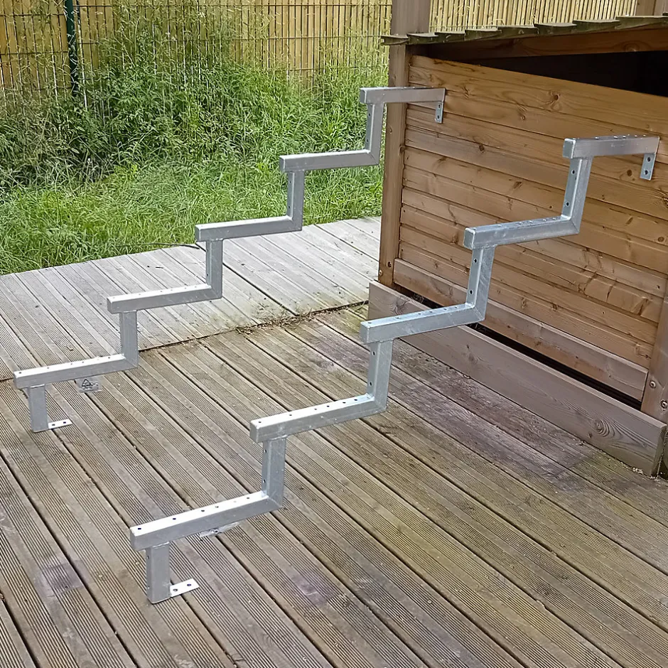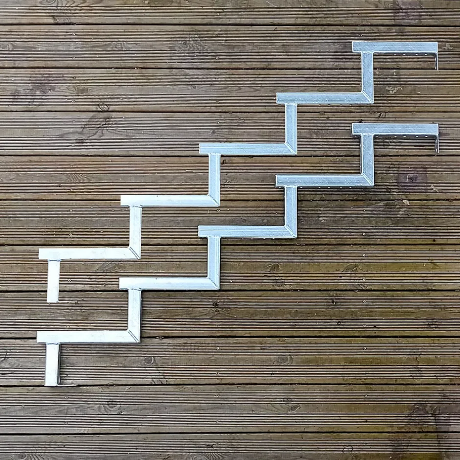 Pack 2 pièces – Limon acier galvanisé 5 marches – H 85cmVous souhaitez créer vos propres escaliers de terrasse avec des limons d’escaliers en acier galvanisé à chaud pour votre terrasse ou simplement pour compenser une différence de hauteur dans votre espace extérieur ?Apportez une touche esthétique moderne et industrielle à votre jardin. Alors vous pouvez utiliser nos nouveaux limons d’escalier très pratiques ! Les limons en acier sont disponibles dans les tailles de 2, 3, 4, 5, 6, 7 et 8 marches et le nombre nécessaire dépend de la largeur de vos escaliers. Placez les limons d’escalier à une distance maximale de 60 cm et fixez les planches en bois dessus. Pour les marches en bois, nous recommandons nos marches en bois autoclave classe 4.Épaisseur des limons : 3 cmProfondeur des marches : 28 cmHauteur des marches : 17 cmEn acier galvanisé à chaud2 marches : hauteur 34 cm, emprise au sol 53 cm3 marches : hauteur 51 cm, emprise au sol 78 cm4 marches : hauteur 68 cm, emprise au sol 103 cm5 marches : hauteur 85 cm, emprise au sol 128 cm6 marches : hauteur 102 cm, emprise au sol 153 cm7 marches : hauteur 119 cm, emprise au sol 178 cm8 marches : hauteur 136 cm, emprise au sol 203 cmLivré sans vis en acier ni planches en bois pour les marches.Les limons en acier galvanisé ne peuvent pas être fabriqués sur mesure.Nous recommandons le nombre suivant de limons d’escalier pour construire vos propres escaliers de terrasse :Largeur des marches en bois 60 à 100 cm : 2 limons en acierLargeur 120 à 160 cm : 3 limons en acierPour chaque largeur supplémentaire de 60 cm, un limon supplémentaire doit être placé.