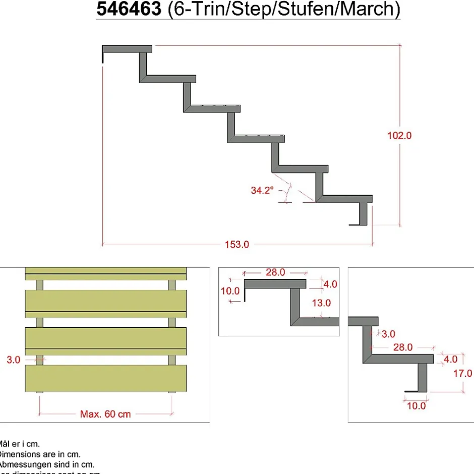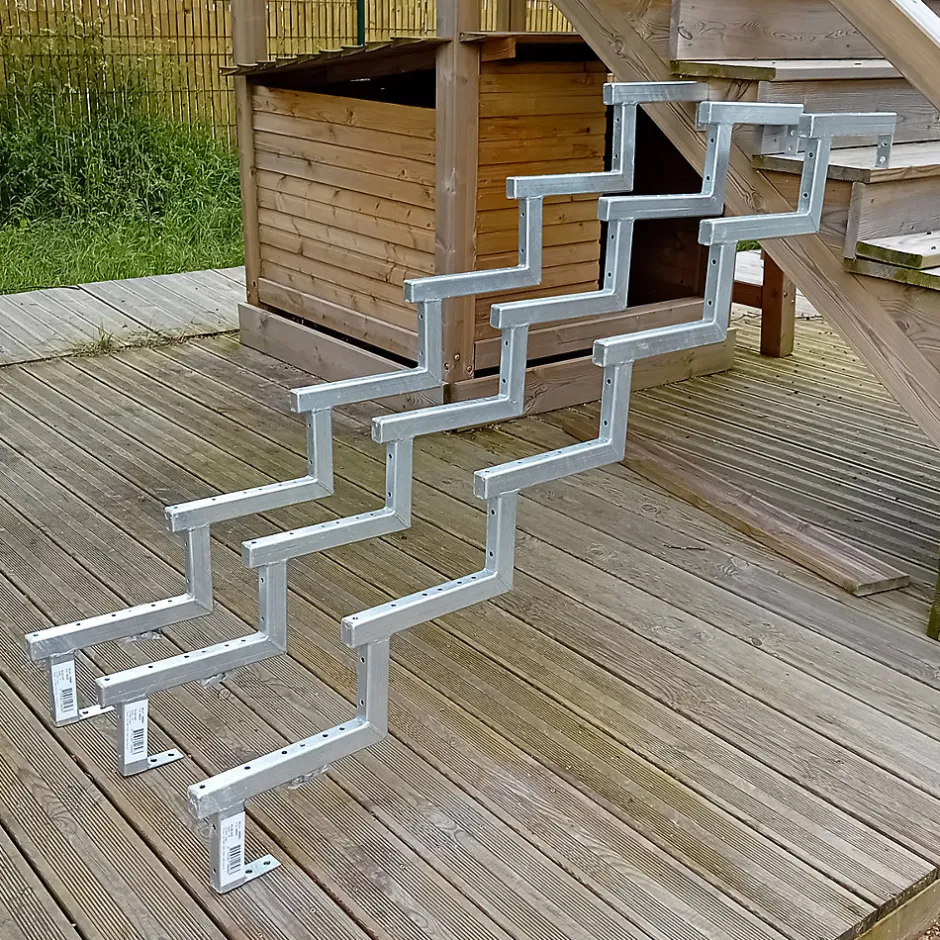 Pack 3 pièces – Limon acier galvanisé 6 marches – H 102cmVous souhaitez créer vos propres escaliers de terrasse avec des limons d’escaliers en acier galvanisé à chaud pour votre terrasse ou simplement pour compenser une différence de hauteur dans votre espace extérieur ?Apportez une touche esthétique moderne et industrielle à votre jardin. Alors vous pouvez utiliser nos nouveaux limons d’escalier très pratiques ! Les limons en acier sont disponibles dans les tailles de 2, 3, 4, 5, 6, 7 et 8 marches et le nombre nécessaire dépend de la largeur de vos escaliers. Placez les limons d’escalier à une distance maximale de 60 cm et fixez les planches en bois dessus. Pour les marches en bois, nous recommandons nos marches en bois autoclave classe 4.Épaisseur des limons : 3 cmProfondeur des marches : 28 cmHauteur des marches : 17 cmEn acier galvanisé à chaud2 marches : hauteur 34 cm, emprise au sol 53 cm3 marches : hauteur 51 cm, emprise au sol 78 cm4 marches : hauteur 68 cm, emprise au sol 103 cm5 marches : hauteur 85 cm, emprise au sol 128 cm6 marches : hauteur 102 cm, emprise au sol 153 cm7 marches : hauteur 119 cm, emprise au sol 178 cm8 marches : hauteur 136 cm, emprise au sol 203 cmLivré sans vis en acier ni planches en bois pour les marches.Les limons en acier galvanisé ne peuvent pas être fabriqués sur mesure.Nous recommandons le nombre suivant de limons d’escalier pour construire vos propres escaliers de terrasse :Largeur des marches en bois 60 à 100 cm : 2 limons en acierLargeur 120 à 160 cm : 3 limons en acierPour chaque largeur supplémentaire de 60 cm, un limon supplémentaire doit être placé.