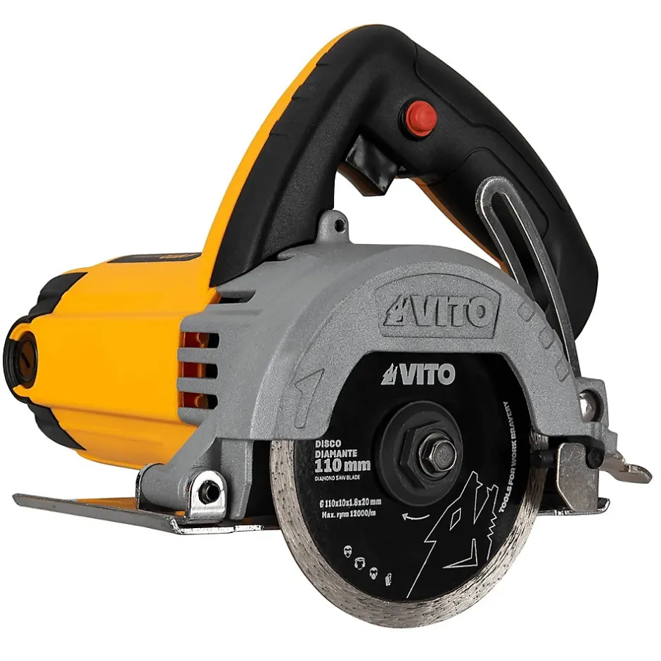 Scie circulaire à carrelage électrique VITO 1550W 230V. Carrelage, Pierre, Granit, Céramique, Marbre. Découpe carrelage avec refroidissement à eau. Tuyau 4,5 m pour le raccordement à l’eau fourni. Profondeur de coupe 34 mm avec réglage rapide. Diamètre du disque de coupe 110 mm. Alésage disque 20 mm. Épaisseur disque 1.8 mm. 12000 tours/min. Interrupteur marche/arrêt. Poignée ergonomique souple. Poids 3.5 kg.