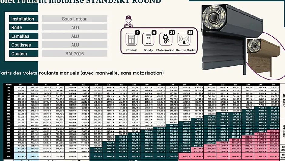 « Volet roulant motorisé pour intégrationConçu en aluminium haut de gamme, ce volet roulant motorisé pour intégration associe robustesse, durabilité et design contemporain. Il convient aussi bien aux constructions neuves qu’aux rénovations exigeantes, et apporte une solution fiable pour protéger vos ouvertures tout en améliorant le confort au quotidien.Sa finition thermolaquée RAL 7016 (gris anthracite) assure un rendu homogène, une excellente tenue dans le temps et un entretien réduit. La motorisation, disponible en commande radio ou filaire, garantit une utilisation fluide et pratique. Les lamelles aluminium H40 participent à la stabilité de l’ensemble et contribuent à l’isolation thermique et acoustique selon la configuration du bâtiment.Points forts•Intégration discrète et esthétique, adaptée à la majorité des façades.•Aluminium thermolaqué : résistance aux intempéries, tenue des couleurs, entretien limité.•Motorisation au choix : commande radio ou filaire pour un usage simple et régulier.•Lamelles aluminium H40 : conception stable et durable.•Garantie constructeur : 20 ans sur la structure aluminium.⸻Dimensions de la boîte (selon largeur L)•L 2700 mm : 205 × 205 mm⸻Caractéristiques techniques•Finition / Couleur : aluminium thermolaqué RAL 7016 (gris anthracite)•Boîte et coulisses : aluminium•Lamelles : aluminium – H40•Motorisation : radio et filaire•Commande : bouton radio ou commande filaire•Conformité : conforme aux normes européennes applicables en matière de sécurité et d’isolation »