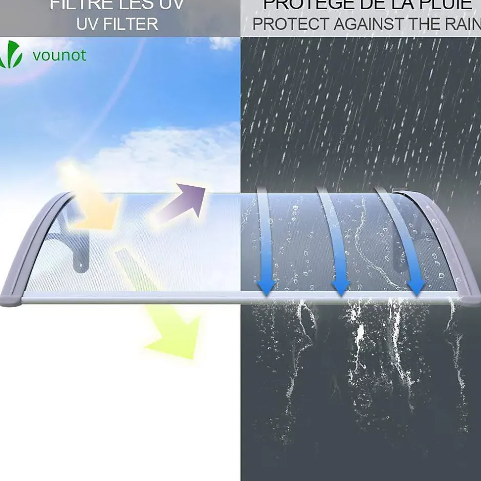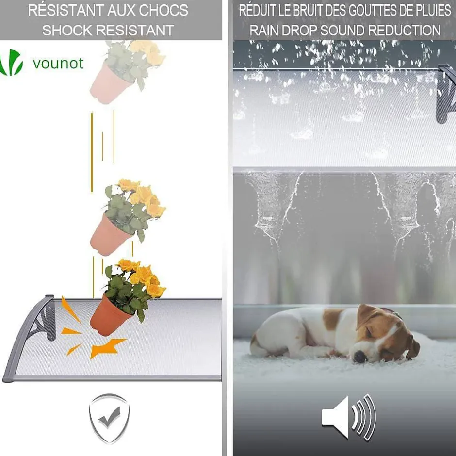 POURQUOI CHOISIR NOTRE PRODUIT ?Notre auvent de porte est une idée parfaite contre tous les intempéries. Cela donne non seulement à la maison une décoration élégante, mais offre également une protection contre le soleil, la pluie et la neige. Facile à installer et convient pour plusieurs endroits. Pratique pour aménager votre extérieur devant une porte d’entrée mais pas seulement. Auvent de porte en Polycarbonate, léger et stable. La plaque en polycarbonate (épaisseur de 6 mm) est résistante à la corrosion et aux chocs. Le cadre voûté en PPO est renforcé par des bandes aluminiums. Cadre voûté arrondi en plastique rigide robuste. Résistance face à la corrosion, au vent, la pluie, à la pluie et aux rayons UV, etc. Moins bruyant par temps de pluie ou de grêle.Marquise en Polycarbonate – Le cadre voûté en PPO qui est résistant au feu, aux UV, à la pluie, à la neige, et aux chocs. Sa résistance aux intempéries est de l’ordre de -40 ℃ à 120 ℃.ABS Support en Plastique – La conception ondulée du cadre de support multipoint fournit trois points de support de style européen.Bande d’Extrémité – AluLe cadre est renforcé par des bandes d’extrémités en aluminium. La stabilité de l’aluminium, la résistance à l’oxydation et la bonne ductilité de l’aluminium permettent à la voile de résister aux vents violents et aux fortes pluies.Tous les Accessoires – L’installation est simple à l’aide du manuel et kit de fixation mural fourni.CARACTÉRISTIQUES : Poids : 3.5kg Epaisseur de plaque : 6mm Tailles Disponibles : 200CM*80CM ; 120CM*80CM ; 100CM*80CM Matériaux : Polycarbonate, Aluminium A fixer au mur Conforme aux normes de sécurité en vigueur dans l’UE