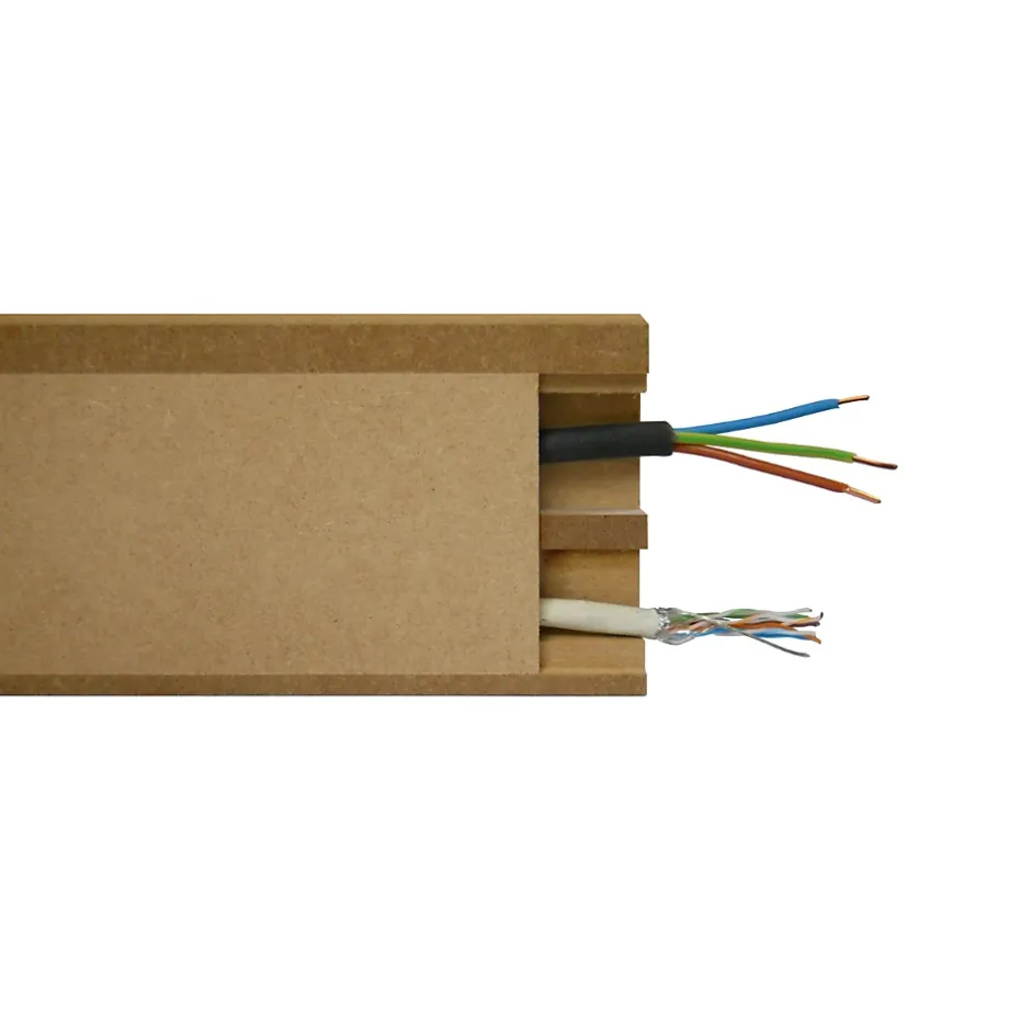 Lot de 5 plinthes MDF passe-câbles avec couvercle à clipser – L. 2,44 m x H. 11 cm – Ép. 18 mmOptimisez votre aménagement intérieur avec ce lot de 5 plinthes MDF passe-câbles : la solution idéale pour dissimuler les fils et câbles (TV, internet, box, home cinéma, hi-fi, bureau…) tout en conservant une finition propre et actuelle. Avec leur hauteur de 11 cm, elles couvrent efficacement les zones de passage et contribuent à un rendu plus net le long des murs.Le système intègre des couvercles en façade permettant de refermer le passage de câbles et de conserver un accès simple si vous devez ajouter ou retirer des fils. Fabriquées en MDF brut, ces plinthes peuvent être peintes afin de s’accorder à votre décoration intérieure ou à la couleur de vos murs.Points forts :- Plinthe cache-câbles / passe-fils : câbles masqués pour un intérieur mieux organisé- Couvercles en façade : fermeture propre et accès pratique aux câbles- MDF : surface régulière, adaptée à une pose en intérieur et à une finition soignée- Facile à poser et à découper : s’adapte aux longueurs de murs et aux angles- Nos maîtres mots sont qualité, disponibilité et savoir-faire- Livraison rapide partout en FranceConseils de pose :Fixez la plinthe au mur (colle ou fixation adaptée à votre support), passez vos câbles dans le logement prévu, puis mettez en place les couvercles en façade pour refermer le passage et finaliser la pose.Nos suggestions de réalisations : Parfait pour les intérieurs modernes qui exigent à la fois une esthétique soignée et une gestion efficace des câbles (salon TV, bureau, chambre, entrée, zones multimédia).
