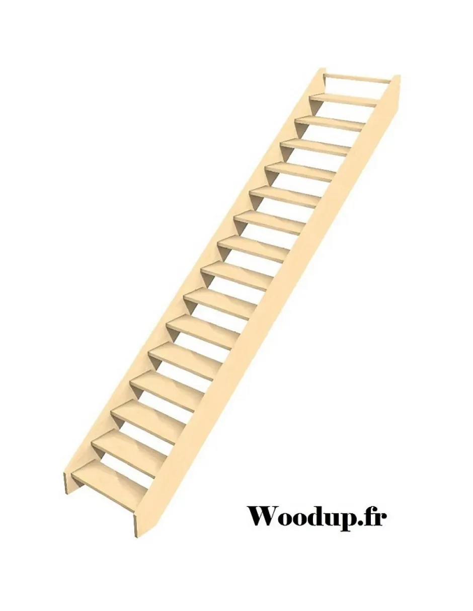 Escalier droit en hêtre lamellé collé ou sapin livré en kit, hauteur 280 cm. 14 marches, largeur 80 cm. Disponible avec ou sans contremarches et rampe.