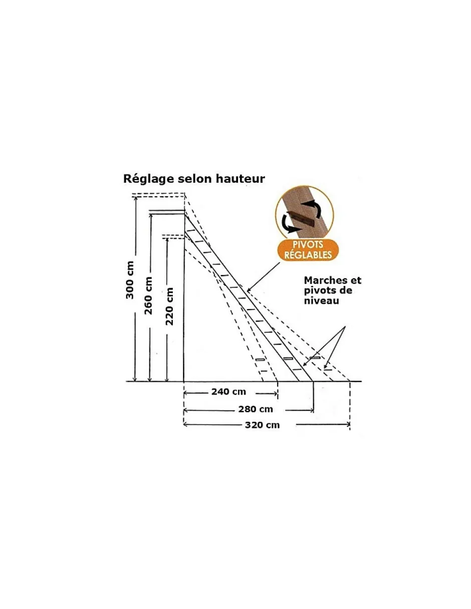 Escalier droit en sapin (195 x 34 mm) livré en kit, hauteur 220 cm. 14 marches, largeur De 60 à 90 cm (hors rampe). Disponible avec ou sans rampe.