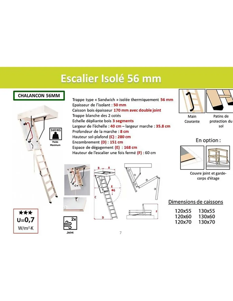 Accédez à vos combles facilement grâce à cet escalier escamotable en bois isolé. Sa trappe sandwich de 56 mm, avec un isolant intégré de 50 mm, garantit une excellente isolation thermique (U = 0.7 W/m².K). Livré avec une main courante et des patins de protection pour le sol, il assure une sécurité optimale. Adapté aux hauteurs de plafond jusqu’à 2m80, cet escalier compact est équipé de 3 segments pliants et de marches larges pour un confort d’utilisation. Sa trappe blanche peut être peinte pour s’intégrer à votre décoration. Dimensions disponibles : 120×55, 120×60, 120×70 cm et 130×55, 130×60, 130×70 cm.