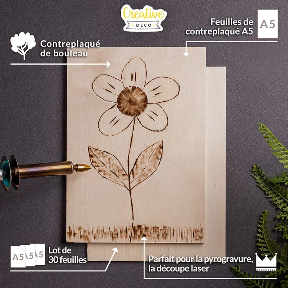 TAILLE IDÉALE – Chaque plaque a approximativement le format d’une feuille de papier A5. La longueur et la largeur du panneau ont une tolérance de +/-2 mm. Parfait pour du bricolage, du vernissage, des projets DIY, de la pyrogravure, des maquettes, du découpage, ou de la pyrogravure.BOIS CLASSE B/B – Nos planches se distinguent par une surface lisse et polie, garantissant au moins une face exempte de défauts. L’autre face peut contenir des défauts réparés d’une taille maximale de 6 cm. Dans certains cas, la face avant peut répondre aux normes de qualité de la classe A au lieu de B, et la face arrière aux normes de la classe C au lieu de B. Tous nos panneaux sont soigneusement vérifiés manuellement, ce qui permet de minimiser les défauts et de garantir la plus haute qualité.USAGE MULTIPLE – Les panneaux de contreplaqué peuvent être utilisés pour de nombreux projets d’artisanat. Vous pouvez faire de belles gravures, des ornements, des découpes et bien plus encore, comme de jolies décorations comme des planches avec des noms, des formes différentes, des signes pour des occasions telles qu’un anniversaire, Noël, Pâques, un baptême ou des enseignes de porte – il y a de nombreuses possibilités !DÉFORMATIONS RARES – Si la plaque se déforme accidentellement, mouillez le côté concave et séchez le côté convexe. Utilisez une éponge ou un pulvérisateur pour humidifier le côté concave du contreplaqué (eau chaude). Ensuite, posez la planche côté humide vers le bas sur le sol pour 2 jours.FABRIQUÉ DANS L’UE – Nous nous procurons nos produits dans l’Union européenne, qui applique certaines des normes les plus élevées au monde. C’est pourquoi, nous pouvons garantir une haute qualité de nos produits à nos clients. Nos produits sont fabriqués à partir de matériaux naturels et non toxiques.
