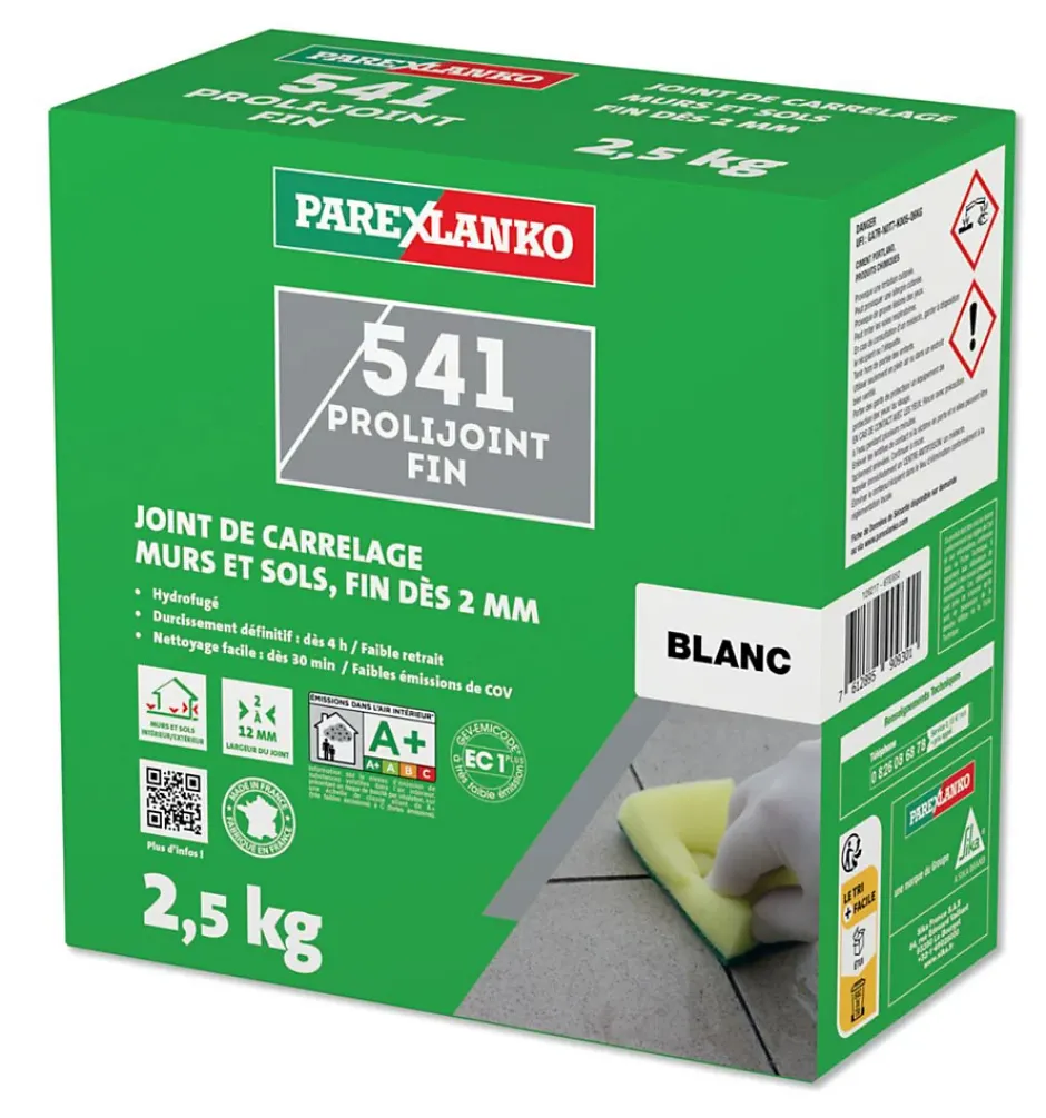 542 Prolijoint Fin de Parexlanko est un produit hydrofugé destiné à la réalisation de joints fins de 2 mm à 12 mm, sur revêtement carrelé. Joint de carrelage avec faible retrait, abrasion réduite et durcissement définitif dès 4 h. Convient pour murs et sols, en intérieur et extérieur coloris blanc 2,5 kg
