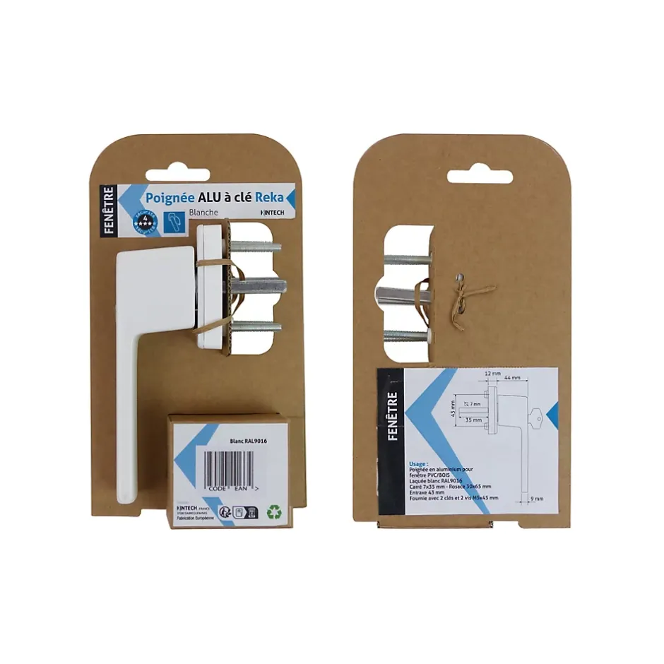 Poignée de fenêtre rectangulaire à clé. Poignée avec un design moderne. Poignée de fenêtre à clé pour système de ferrure OF/OB. Matériau : aluminium. Crantage 4 positions (90°). Poignée pour fenêtre et portes-fenêtres ouvrant à la française ou en oscillant-battant. Compatible avec la majorité des menuiseries PVC et bois. Coloris blanc RAL 9016.