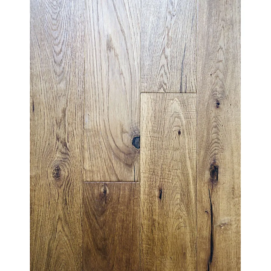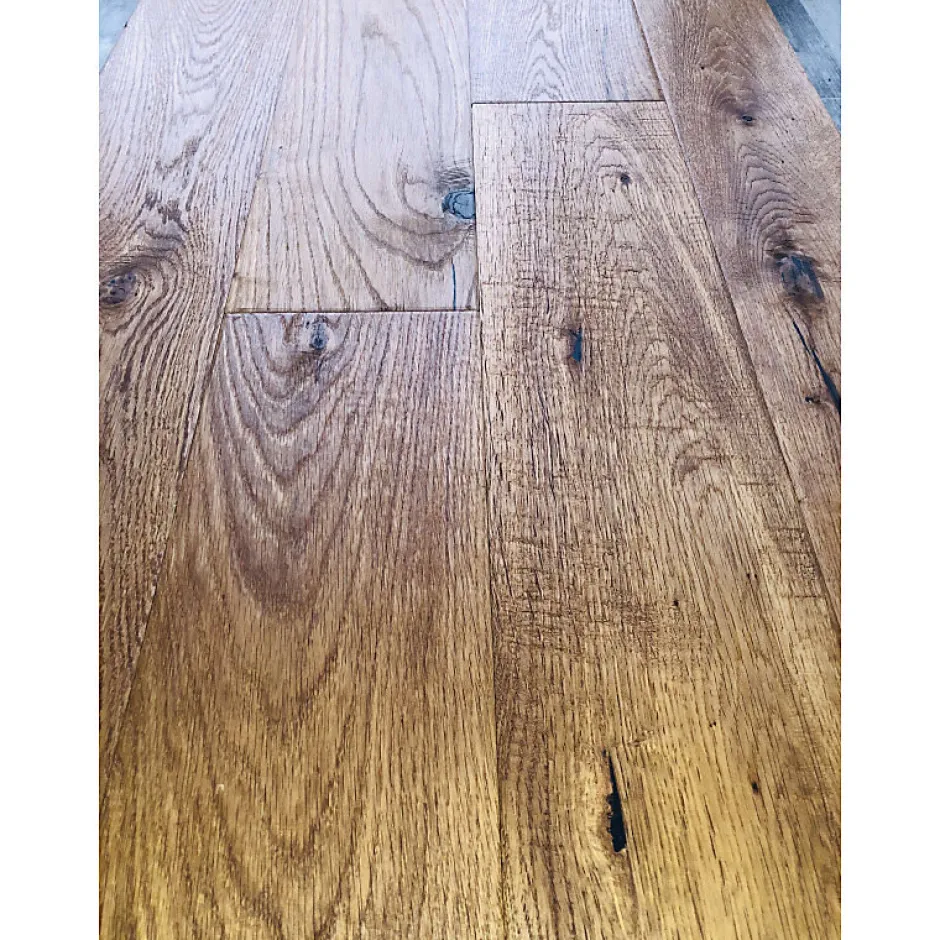 Matière: Chêne contrecollé Dimensions: 15,8X(61-190) CM Epaisseur: 12 mm Couche d’usure : 3 mm Chanfreins: G04 Pose: collée DTU 51.2 ou flottante Loc 5G Sol chauffant: Oui en pose collée Finition: Huilé, Brossé, fumé, raboté vieilli main N’hésitez pas à nous contacter pour demander un échantillon. .