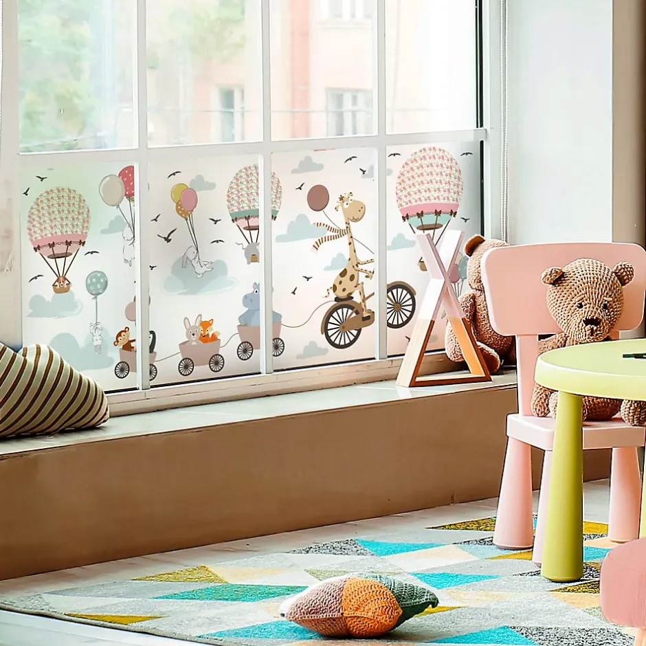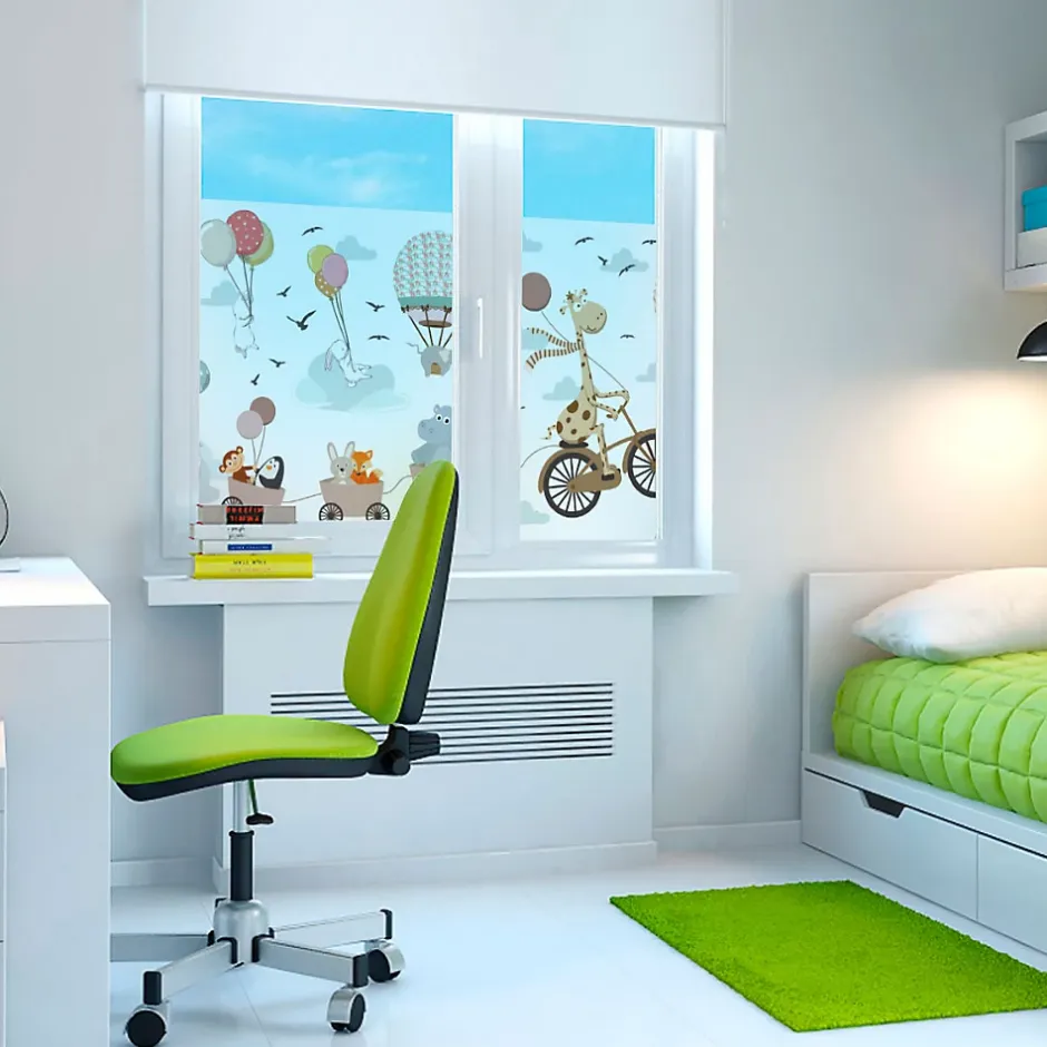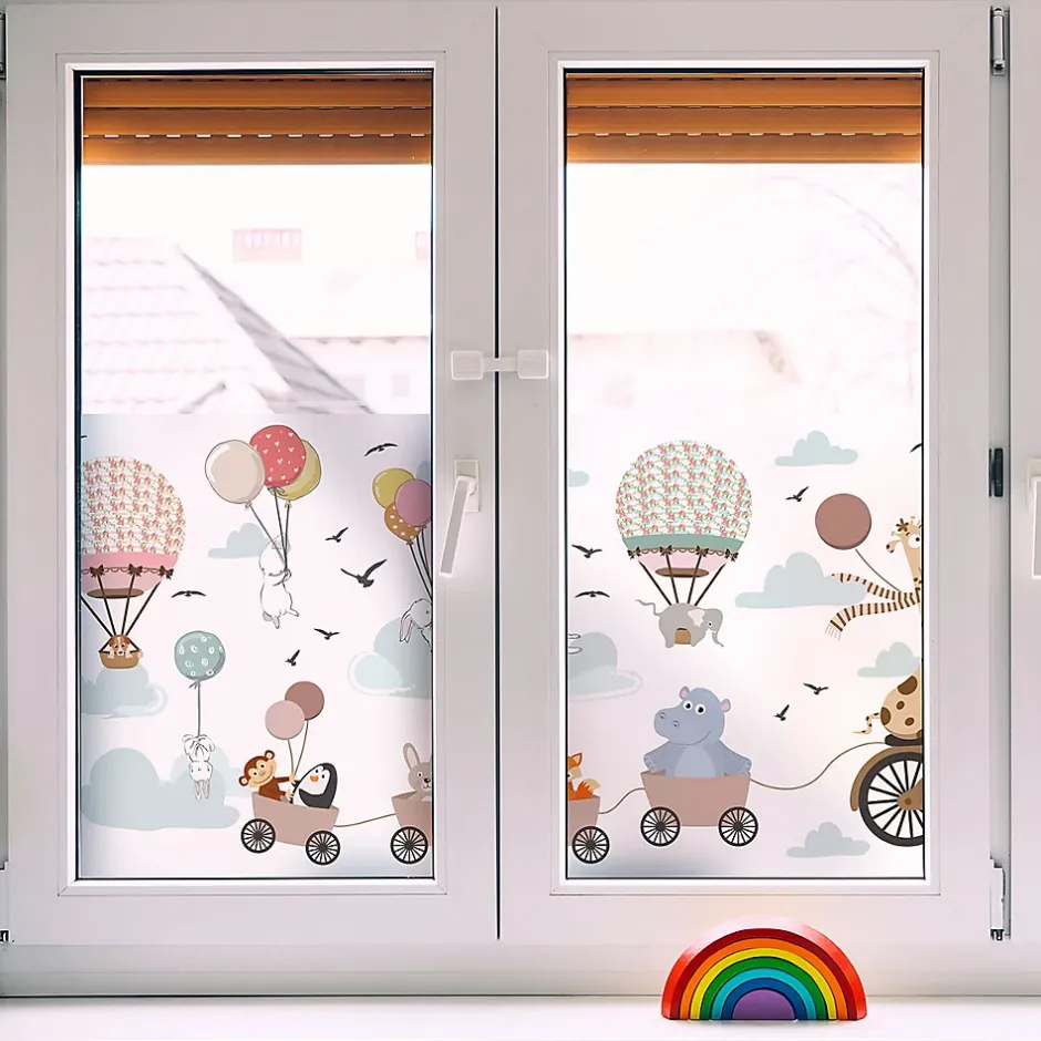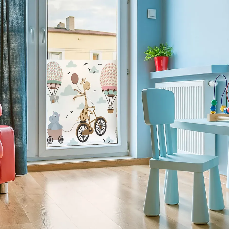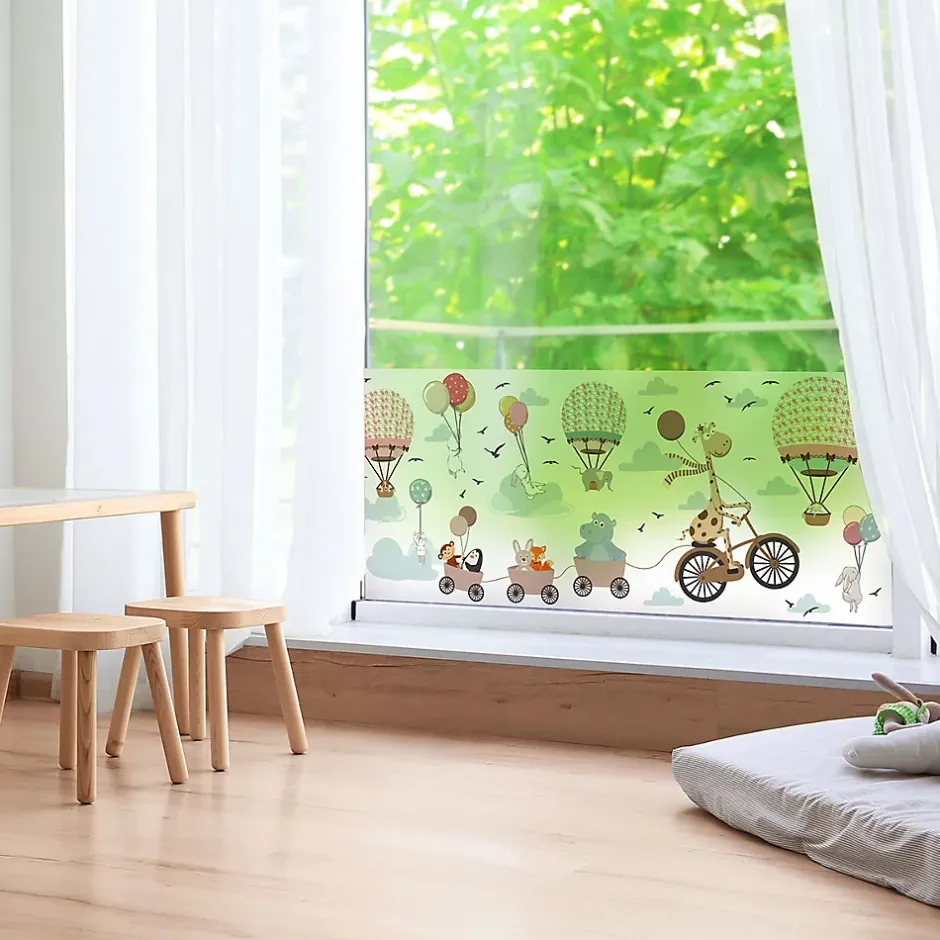 Sticker occultant pour vos fenêtres et votre salle de bain Ce sticker représente les animaux et montgolfières dans les nuages Les animaux sont : la girafe sur son vélo, l’hippopotame, le renard, le lapin, le pingouin et le singe dans les wagons, un lapin dans la montgolfière, un éléphant dans la montgolfière, un chien dans la montgolfière, quatre lapins en ballons, les oiseaux et les nuagesCe sticker occultant et privatif pour fenêtre mesure H40 x L100 cmVitrophanie – Sticker dépoli translucide privatif pour vitres et fenêtres Bubble free – Pose facile sans bulle d’air Ce sticker occultant dépoli laisse passer une lumière douce et diffuse pour plus de confort dans votre intérieur Il limite la visibilité à travers les vitres et permet ainsi d’obtenir sécurité et intimité, tout en décorant votre maison Il empêche aussi les vis-à-vis de jour comme de nuitUne fois appliqué sur une fenêtre, ce sticker : – absorbera 15 % de la lumière visible – transmettra 85 % de la lumière visible Conseil pour la pose: 1/ Découper la longueur nécessaire (prendre un peu plus large) 2/ Humidifier fortement la vitre 3/ Décoller le sticker du papier support et le positionner sur la vitre humide 4/ Racler du centre vers l’extérieur pour retirer l’eau et les bulles d’air 5/ L’humidité permet de le déplacer pour une position parfaite 6/ Laisser sécher 7/ Couper au cutter les bandes qui dépassent de la vitre Durée de vie: 5-8 ans Où coller cet autocollant déco occultant ? Les idées Déco Ambiance Sticker: Ce sticker occultant trouvera facilement sa place sur les baies vitrées, les fenêtres de salle de bain, cuisine, toilette, chambre, et autres fenêtres de la maison, les rambardes vitrées extérieures et intérieures, et même sur les portes de douche Ce sticker occultant peut être aussi utiliser en milieu professionnel: pour les vitres de bureaux, salle d’attente, vitrines de magasin, ou toute autre vitre extérieureL’adhésif occultant fenêtre vous pe