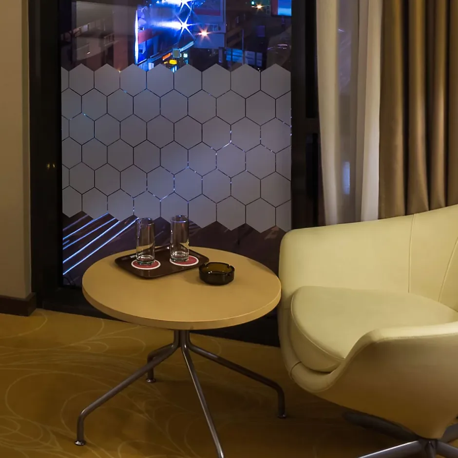 Taille du produit : 50 x 90 cm -50 stickers hexagones 10×9 cm Le sticker occultant hexagone pour votre salle de bain et vos fenêtres Les stickers occultants hexagones et ce 50 stickers occultants hexagones pour vitre et porte de douche 50 x 90 cm -50 stickers hexagones 10×9 cm, vous donneront des idées de décoration Description du sticker : La dimension de cette planche de stickers hexagones occultants est de H50 x L90 cm Cette planche se compose de 50 stickers hexagones qui mesurent H10 X L9 cm Où coller cet autocollant déco ? Ce sticker paroi de douche occultant hexagone est parfait pour votre porte salle de douche salle Cet adhésif pour paroi de douche occultant vous permettra de rendre l’atmosphère de votre salle de bain plus design et attrayanteL’adhésif occultant fenêtre hexagone vous permet également de préserver votre intimité lorsque vous êtes à l’intérieur de votre maisonLe sticker occultant hexagone est idéal posé sur une baie vitrée pour masquer le vis à vis dans votre bureau Les stickers occultants hexagones s’intègrent aisément dans tous les intérieurs Descriptions du sticker occultant hexagones : Matériau : Vinyle sablé satin Crystal (spécial pour porte de douche et vitre) Les conseils pour bien poser votre sticker occultant hexagone1 Humidifier la vitre2 Décoller le papier support3 Placer le sticker sur la vitre (l’humidité permet de faire des ajustements)4 Laisser sécher5 Retirer le film de transfert IMPORTANT : Vous avez la possibilité de disposer du sticker occultant hexagone de la façon dont vous souhaitez Ce qui donne des multiples idées pour décorer votre intérieur