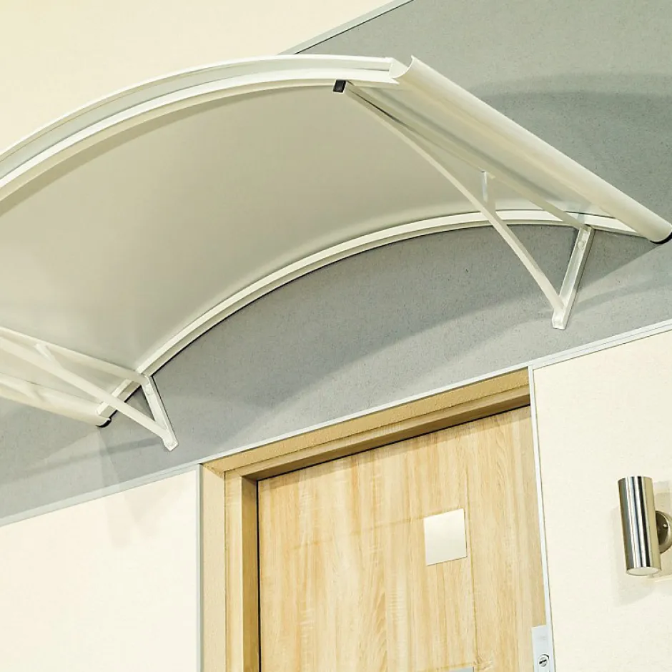 Auvent à forme arrondie, soutenue par deux consoles, structure en aluminium thermolaqué, joint d’étanchéité côté mur, couverture en panneau composite Al/PE/Al, anthracite sur la face supérieure et blanc sur la face intérieure. Auvent extrêmement résistant au style industriel.