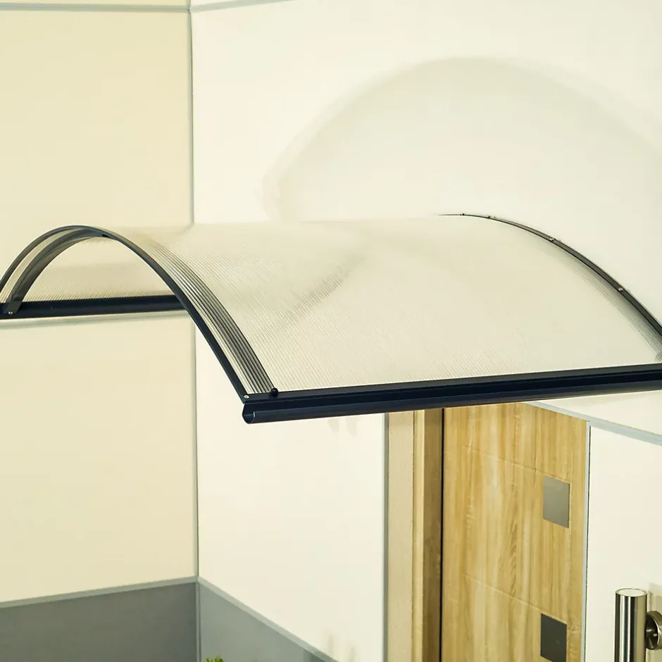 Auvent cintré doté de deux gouttières latérales assurant l’évacuation efficace des eaux pluviales. Structure en aluminium thermolaqué, résistante à la corrosion. Panneau en polycarbonate alvéolaire offrant une excellente durabilité et protection contre les UV