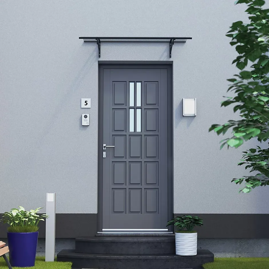 Auvent de type marquise, soutenue par deux consoles de style rétro, avec gouttière d’évacuation des eaux en façade, joint d’étanchéité côté mur, couverture en plaque de polycarbonate compact transparent avec filtre UV, aluminium thermolaqué.