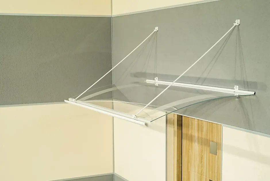 Auvent de type marquise, fixé en partie supérieure à la façade au moyen de tirants, structure en aluminium thermolaqué, équipé d’une gouttière et d’un joint d’étanchéité mural.