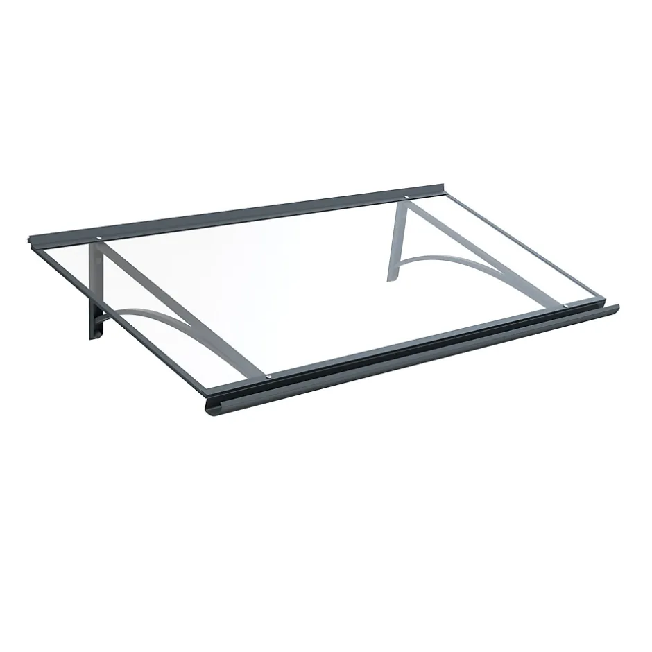 Auvent plat, sur 2 consoles, structure en aluminium thermolaqué, couverture en plaque de PMMA, joint d’étanchéité protégeant la façade côté mur, gouttière en partie frontale.