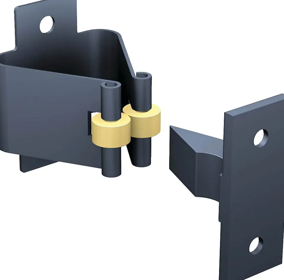Arrêt à pince traité par cataphorèse, finition noire, avec mentonnet à visser et fixations incluses, conçu pour portillons à déplacement latéral – série courante.